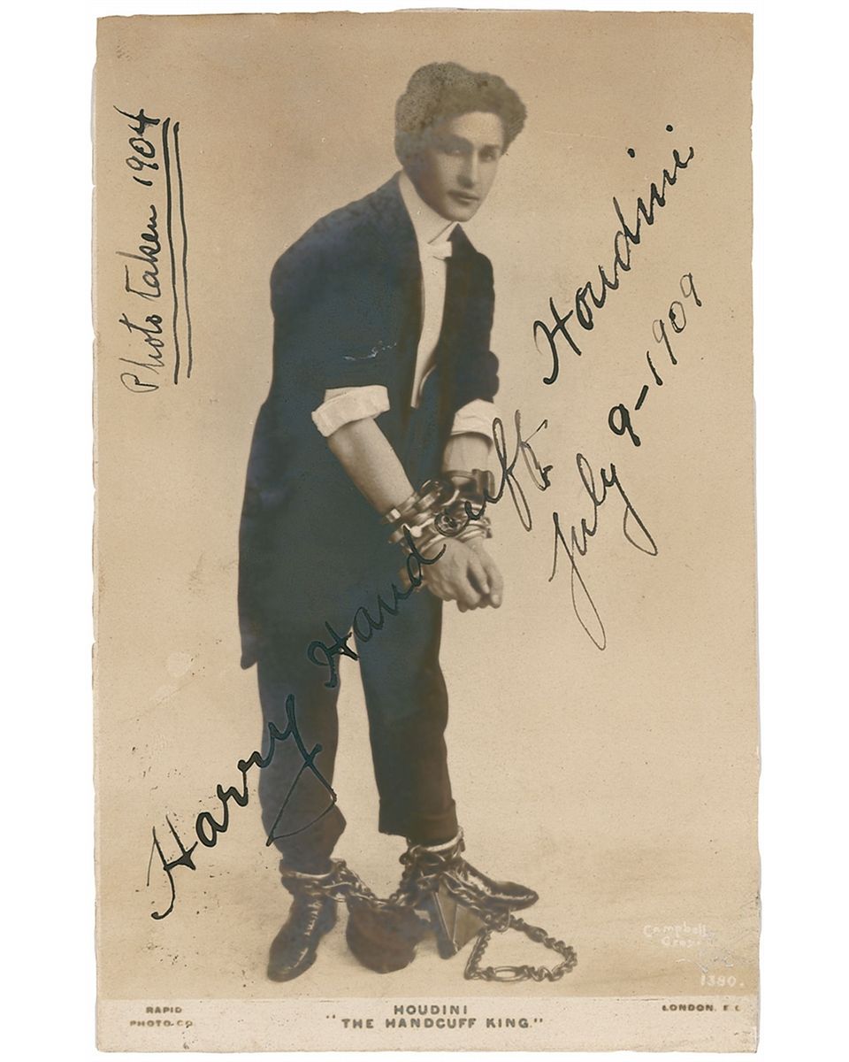 Vintage 3.25 x 5 full-length postcard photo of Houdini in shackles, signed in fountain pen., “Harry Handcuff Houdini, July 9—1909,” adding “Photo taken 1904” along the left edge. In very good condition, with trimmed edges, scattered light silvering, a few creases, mounting remnants to reverse, and some scattered light soiling and discoloration. Signed photos of Houdini in chains are highly sought after.