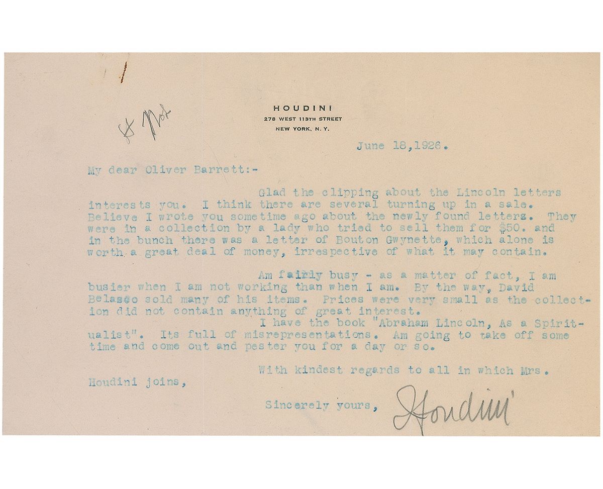 TLS signed in pencil, “Houdini,” one page, 8.5 x 5.5, personal letterhead, June 18, 1926. Letter to prolific Lincoln collector Oliver Barrett. In full: “Glad the clipping about the Lincoln letters interests you. I think there are several turning up in a sale. Believe I wrote you some time ago about the newly found letters. They were in a collection by a lady who tried to sell them for $50. and in the bunch there was a letter of Bouton Gwynette [sic], which alone is worth a great deal of money, irrespective of what it may contain. Am fairly busy—as a matter of fact, I am busier when I am not working than when I am. By the way, David Belasco sold many of his items. Prices were very small as the collection did not contain anything of great interest. I have the book ‘Abraham Lincoln, As a Spiritualist.’ Its full of misrepresentations. Am going to take off some time and come out and pester you for a day or so.” In fine condition, with two vertical mailing folds, one passing through a single letter of the signature, a rusty paperclip mark and impression to the top, and a pencil notation to the upper left. Button Gwinnett remains one of the most sought after autographs to this day, a necessity for a complete set of the signers of the Declaration of Independence. A letter with fantastic content from the early days of autograph collecting.