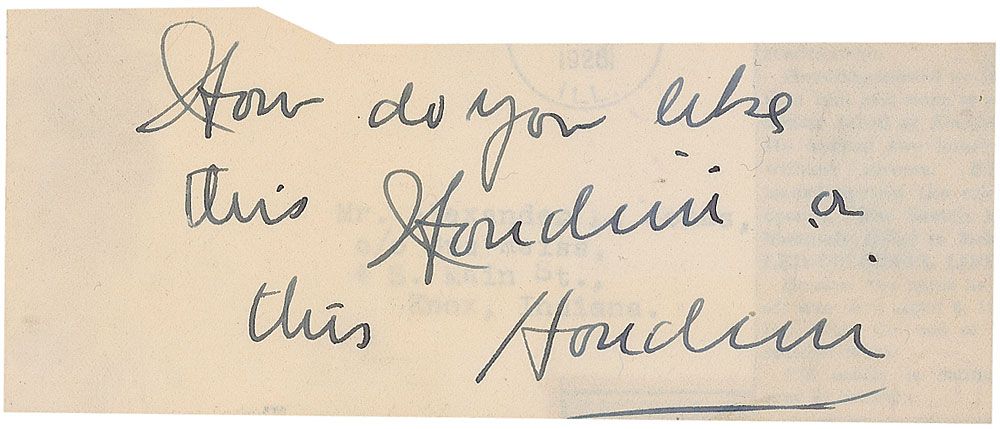 Ink signature, “How do you like this Houdini or this Houdini,” on an off-white 5.25 x 2.25 irregularly clipped slip. Slip is affixed by its top edge to the address panel of the original mailing envelope, with Houdini’s return address stamped in the upper