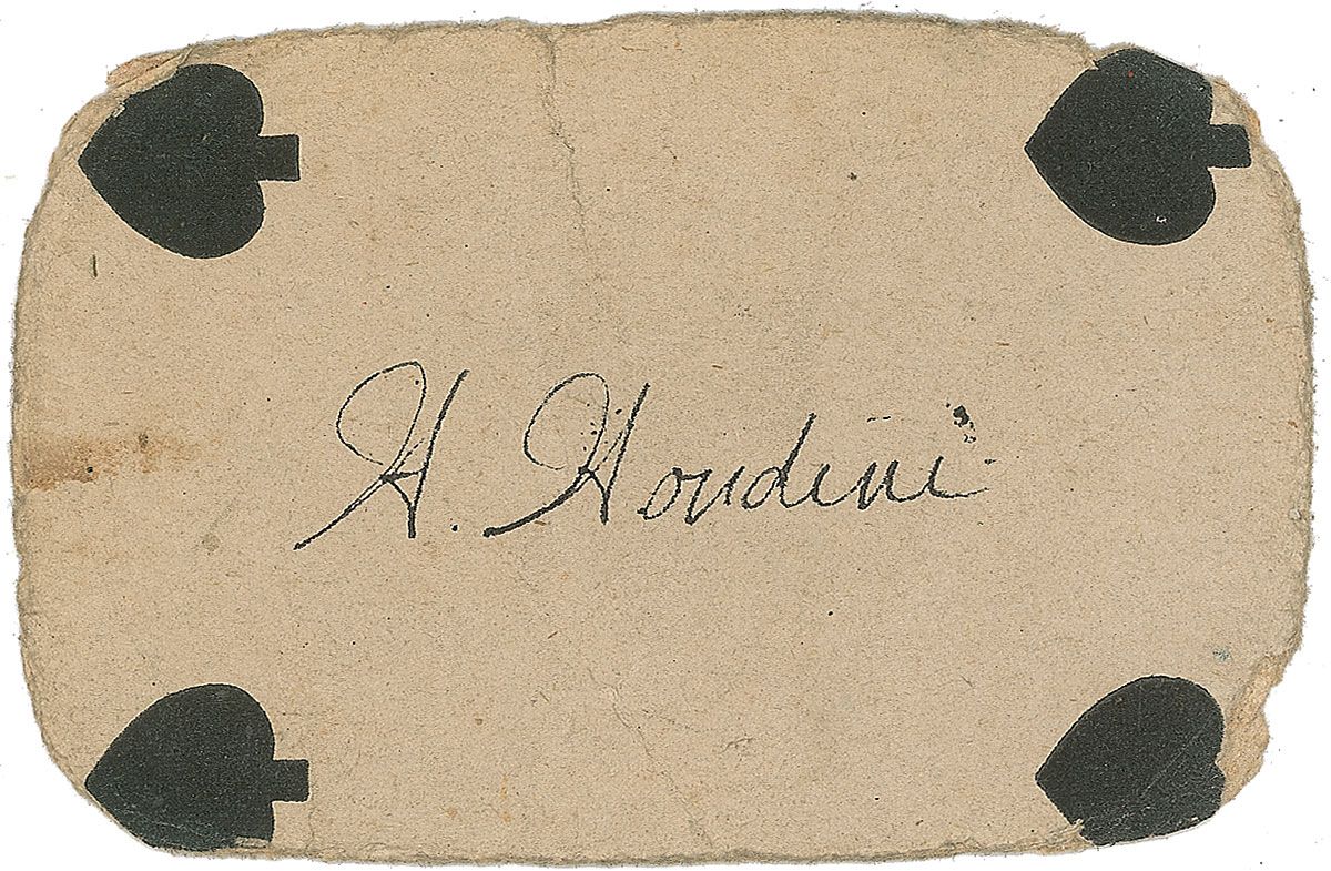 Incredible magician’s four of spades playing card, 3.5 x 2.25, neatly signed in black ink, “H. Houdini.” Back of the card is printed with an ‘optical illusion’ design. In very good condition, with scattered creases, small stain to left edge, and rounding wear to edges and corners. Originates from the estate of the long time editor of The Sphinx magazine, Dr. Albert M. Wilson, a pioneering voice in the magical craft and personal friend of Houdini. Upon Wilson’s death in 1930, prominent magician John Mulholland took over the magazine; this signed playing card was later acquired from one of Mulholland’s colleagues. In the beginning of Houdini’s career as a magician, he focused primarily on card tricks—even billing himself as the ‘King of Cards’—an association that increases the already tremendous desirability of this unique piece.