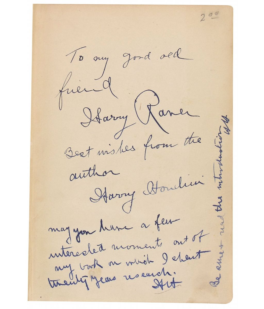 Signed book: The Unmasking of Robert-Houdin. Later printing. NY: The Publishers Printing Company, 1908. Hardcover, 5.75 x 8.25, 333 pages. Signed and inscribed on the first free end page in blue ink, “To my good old friend Harry Raner, Best wishes from the author, Harry Houdini.” Houdini signs again below, “May you have interested moments out of my book on which I spent twenty years research, H. H.,” and again vertically in the right border, “Be sure & read the introduction, H. H.” Autographic condition: fine, with some slight soiling and tiny spot of dampstaining to the lower portion of the signed page. Book condition: G+/None. Brown cloth-covered boards; edges worn, with several small tears in cloth; spine and edges darkened; light waterstaining to lower edges and fore-edges (visible on interior of textblock as well); soiled, with one small black paint spot on front; shaken; few hinges cracked; last page glued to pastedown; and last several pages loosened, chipped, and stained.