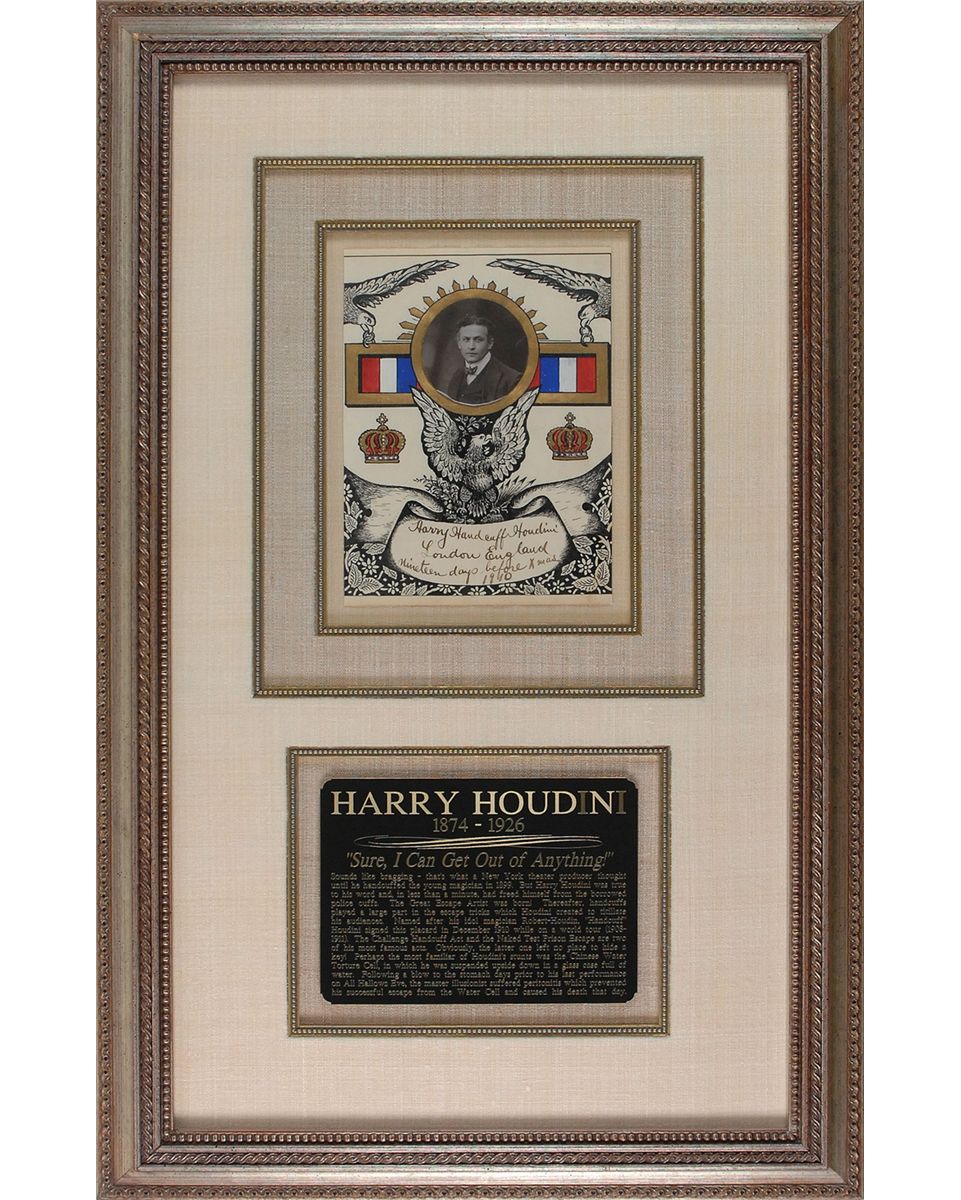 One-of-a-kind vintage signature display on an off-white 6 x 8 sheet, done in an admirer’s hand. Page features a clipped circular portrait of Houdini, surrounded in gold, with two eagles holding gold-bordered French national flags on either side of the portrait. A large eagle and two red and gold crowns are under the portrait, with a scroll and floral borders along the bottom. Display is beautifully signed in the center of the scroll, “Harry Handcuff Houdini, London England, nineteen days before Xmas 1910.” Beautifully triple-cloth-matted and framed with a biographical plaque by the Gallery of History to an overall size of 17.25 x 27. In fine condition. A visually striking and singular piece, with Houdini’s desirable “Handcuff” signature signed during the height of his success. Oversized.