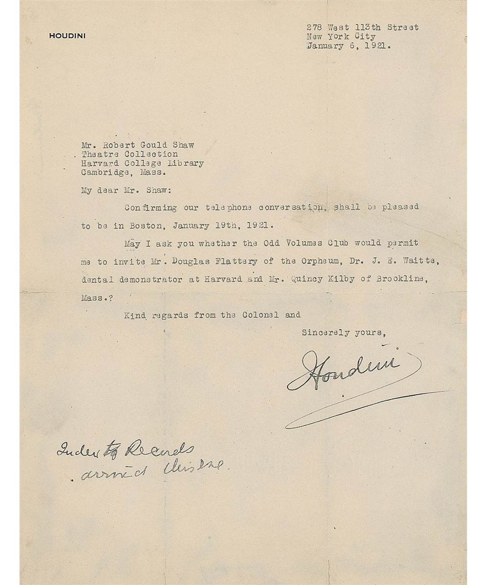 TLS signed “Houdini,” one page, 8.5 x 11, personal letterhead, January 6, 1921. Letter to Robert Gould Shaw of the Harvard College Library. In full: “Confirming our telephone conversation, shall be pleased to be in Boston, January 19th, 1921. May I ask you whether the Odd Volumes Club would permit me to invite Mr. Douglas Flattery of the Orpheum, Dr. J. E. Waitts, dental demonstrator at Harvard and Mr. Quincy Kilby of Brookline, Mass.?” Houdini also added a brief handwritten postscript, “Index to records arrived this eve.” Intersecting folds with small repaired edge separations (one vertical fold passing through second letter of his name), and an unobtrusive professionally repaired tear extending from the right edge through the word “conversation,” otherwise fine condition.