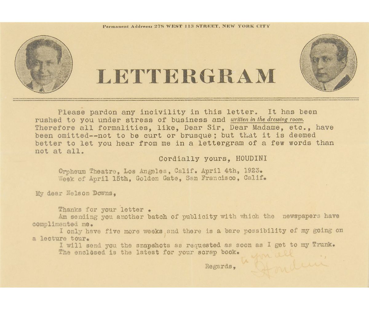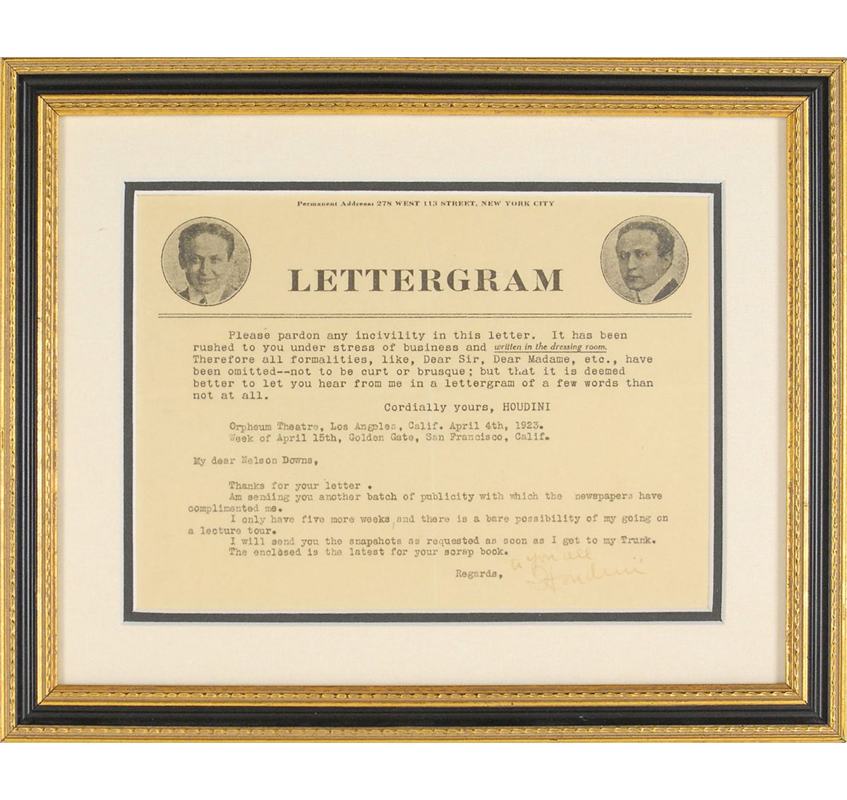 Lettergram, signed “to you all, Houdini,” one page, 8 x 6, preprinted Houdini Lettergram stationery with two images of the magician and his address at the top, followed by a pre-printed introductory paragraph explaining the lack of formalities in a Lettergram. Message, written in April of 1923, to Nelson Downs reads, in full: “Thanks for your letter. Am sending you another batch of publicity with which the newspapers have complimented me. I only have five more weeks and there is a bare possibility of my going on a lecture tour. I will send you the snapshots as requested as soon as I get to my Trunk. The enclosed is the latest for your scrapbook.” Double-matted and framed to an overall size of 11.75 x 9.5. In fine condition, with central horizontal and vertical folds, a uniform shade of mild toning, and signature a bit light, but still completely legible. Thomas Nelson Downs was a world-renowned slight of hand magician, widely known for his impressive coin tricks, earning him the nickname, ‘The King of Koins.’ He retired to Iowa in 1912 and opened a small vaudeville house in his home town, and entertained many visitors and magicians at his home until his passing in 1938.