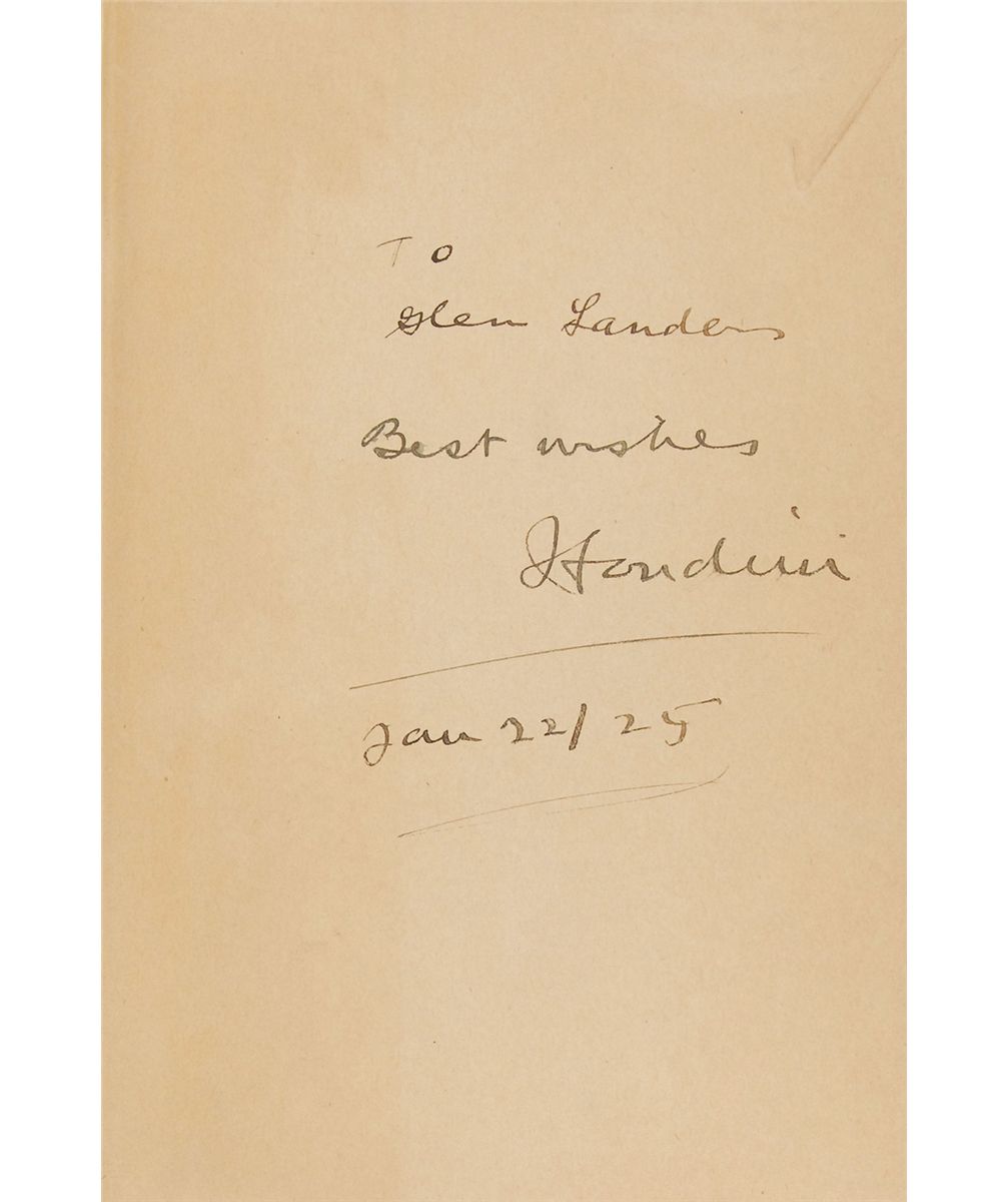 Uncommon signed book: A Magician Among the Spirits. First edition. NY: Harper & Brothers, 1924. Hardcover, 6.5 x 9.5, 294 pages. Signed and inscribed on the first free end page in black ink, “To Glen Landers, Best wishes, Houdini, Jan. 22/25.” Autographic condition: fine, with light toning and a pencil mark to the signed page. Book condition: G+/None.