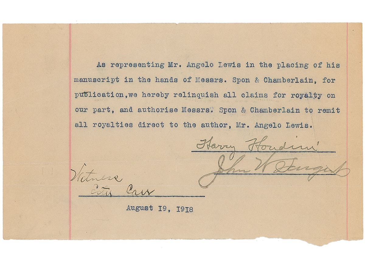 Fabulous collection of three documents: the first is signed by Harry Houdini, his assistant John W. Sargent, and magician Angelo J. Lewis, one page, 8.5 x 7.25, August 17, 1918, certifying that Houdini has Lewis’s permission to “place the manuscript of his book entitled ‘Latest Magic’ with such publishers as to us seems desirable.” The second is signed by Houdini, Sargent, and a witness, one page, 8 x 4.75, August 19, 1918, stating that the publisher is to “pay all royalties direct to the author, Mr. Lewis.” The last is signed by Houdini, Sargent, and several witnesses and publishing representatives, two pages, 8 x 12, August 20, 1918, in which Houdini makes an agreement with the publishing firm Spon and Chamberlain to print “an original manuscript entitled Latest Magic,” further outlining general terms, rights, and financial obligations. In overall fine condition, with expected document wear. Known as ‘Professor Hoffman’ in the magic world, Lewis was one of the greatest amateur magicians of his day and authored several works on the subject—Houdini would later describe him as ‘the brightest star in the firmament of magical literature.’ These contracts resulted in the publication of Latest Magic, Being Original Conjuring Tricks later in 1918, which featured sections including ‘Novel Applications of the ‘Black Art’ Principle,’ ‘Card Tricks,’ ‘Miscellaneous Tricks,’ ‘Concerning Patter,’ and ‘The Use of the Wand.’ With excellent illusionist associations, this is an outstanding selection of important Houdini documents.