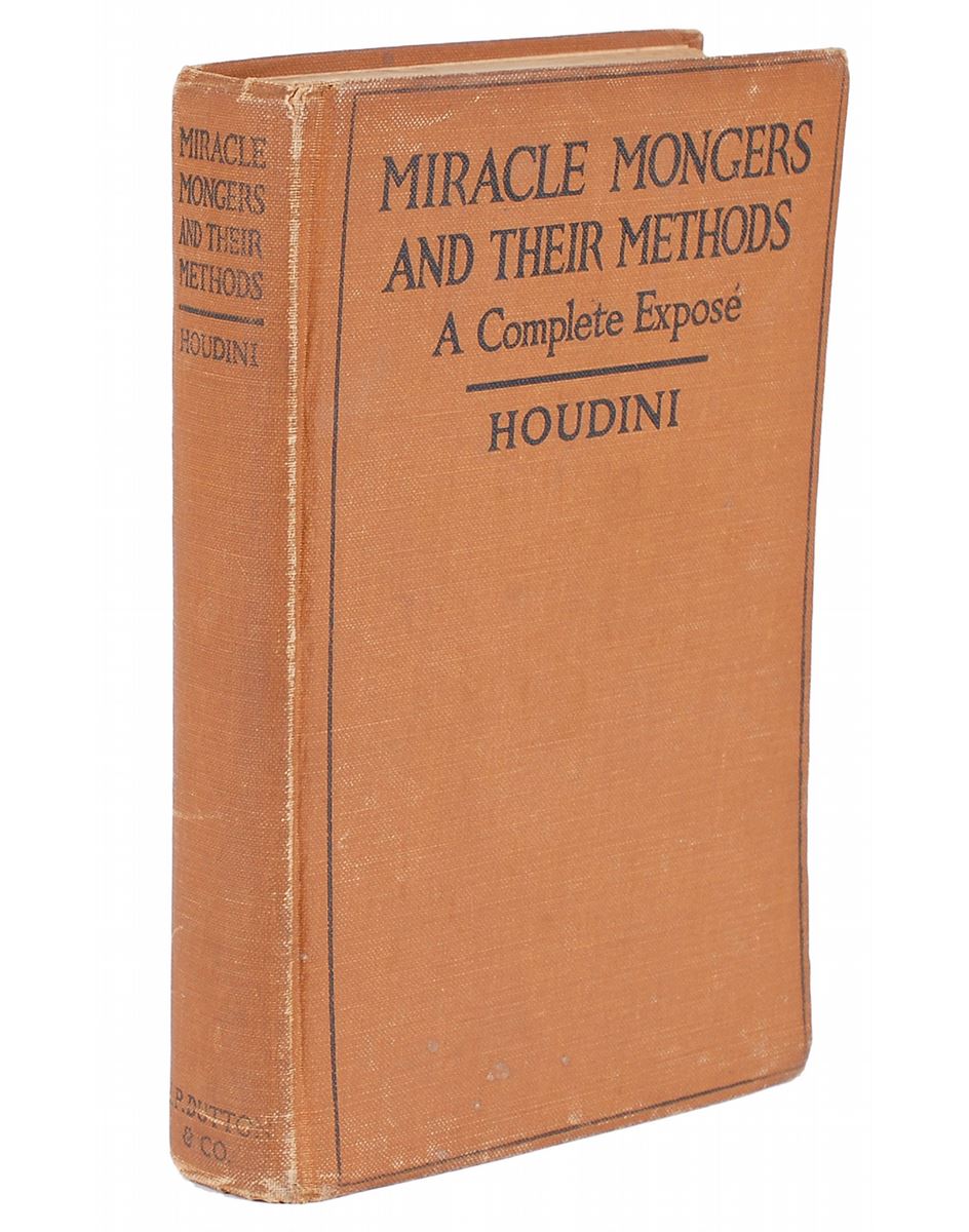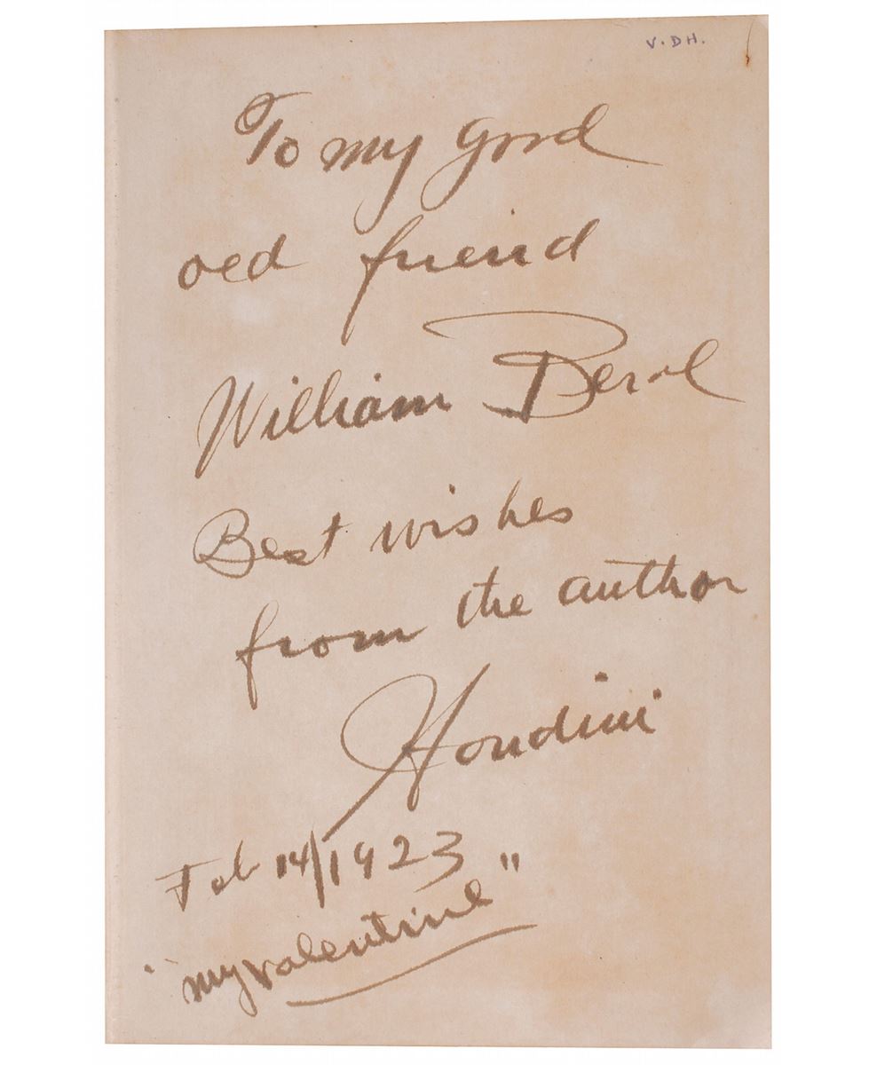 Signed book: Miracle Mongers and Their Methods. Later printing. NY: E. P. Dutton & Company, 1920. Hardcover, 5.5 x 8, 240 pages. Signed and inscribed on the first free end page in fountain pen, “To my good old friend William Beral, Best wishes from the author, Houdini, Feb 14/1923, ‘My Valentine.’” Autographic condition: very good, with toning to first free end page and overall feathering to ink. Book condition: G+/None.