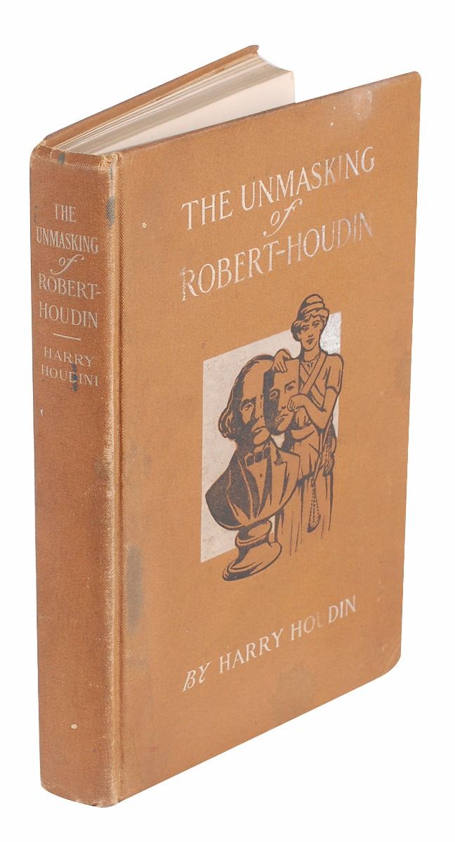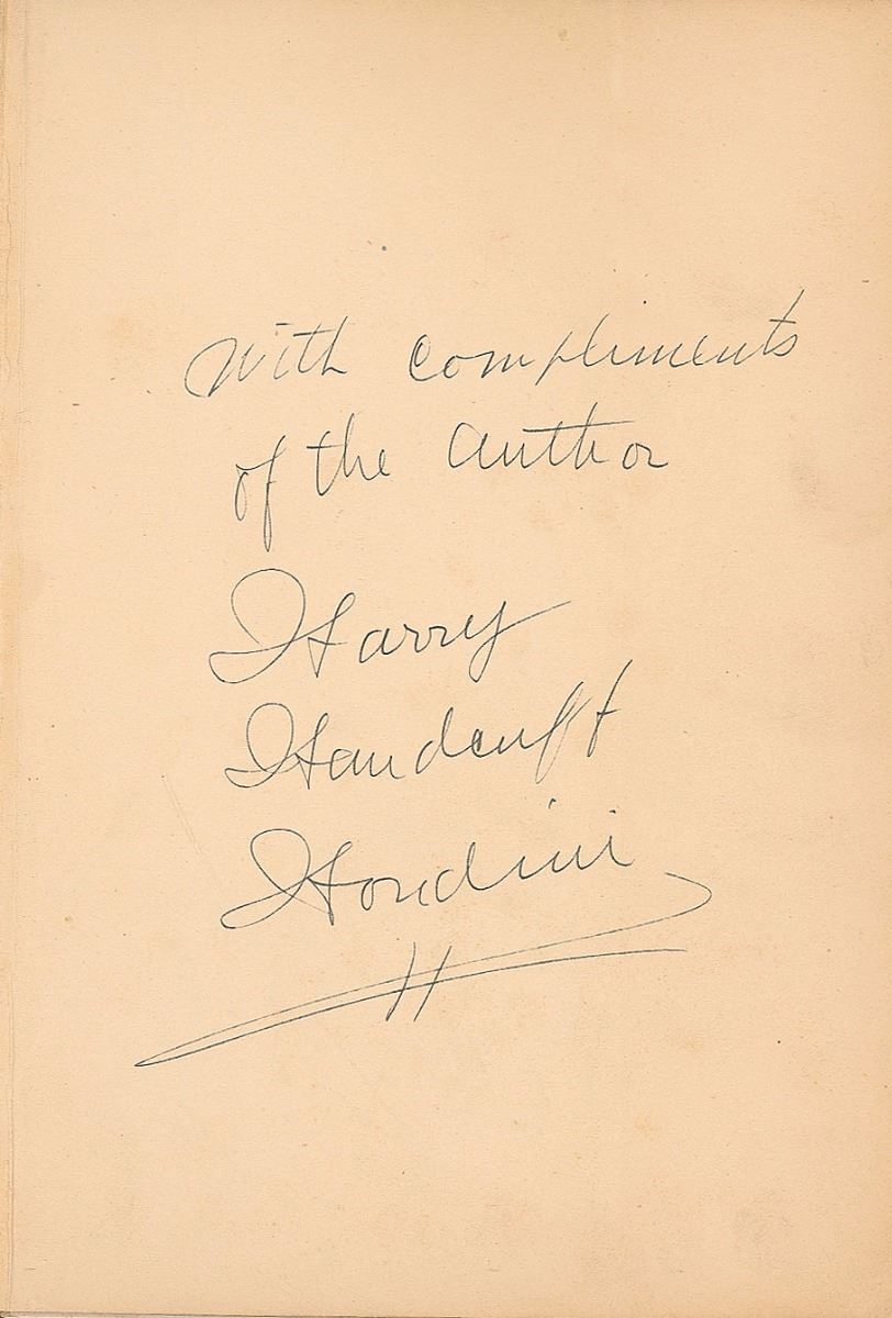 Signed book: The Unmasking of Robert-Houdin. NY: The Publishers Printing Company, 1908. Hardcover, 5.75 x 8.25, 333 pages. Signed on a free end page in black ink, “With compliments of the author, Harry Handcuff Houdini.” Autographic condition: fine, with slight soiling and the lower edge starting to detach from inner hinge. Book condition: G+/None.