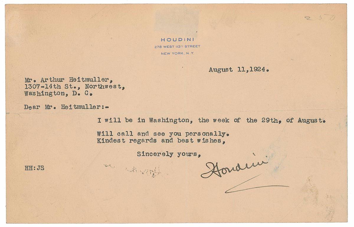 TLS signed “Houdini,” one page, 8.5 x 5.5, personal letterhead, September 11, 1924. Letter to Arthur Heitmuller in Washington, DC. In part: “I will be in Washington, the week of the 29th, of August. Will call and see you personally.” Central vertical and horizontal folds, scattered soiling, and slight show-through from a tape remnant near the top edge, otherwise fine condition. The Heitmuller Art Company was a premier collectibles dealer in Washington that specialized in autographs, manuscripts, and historical prints. Among their inventory were artifacts related to John Wilkes Booth and a collection of items of Dr. Samuel Mudd, who was imprisoned for conspiring with Booth after tending to his broken leg on the night of the assassination. Houdini, famously known as a collector himself, had a keen interest in the Lincoln assassination and hoped to view the material when he was in Washington.