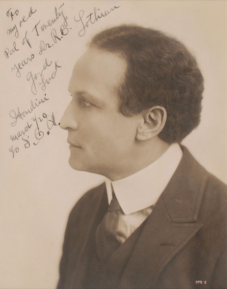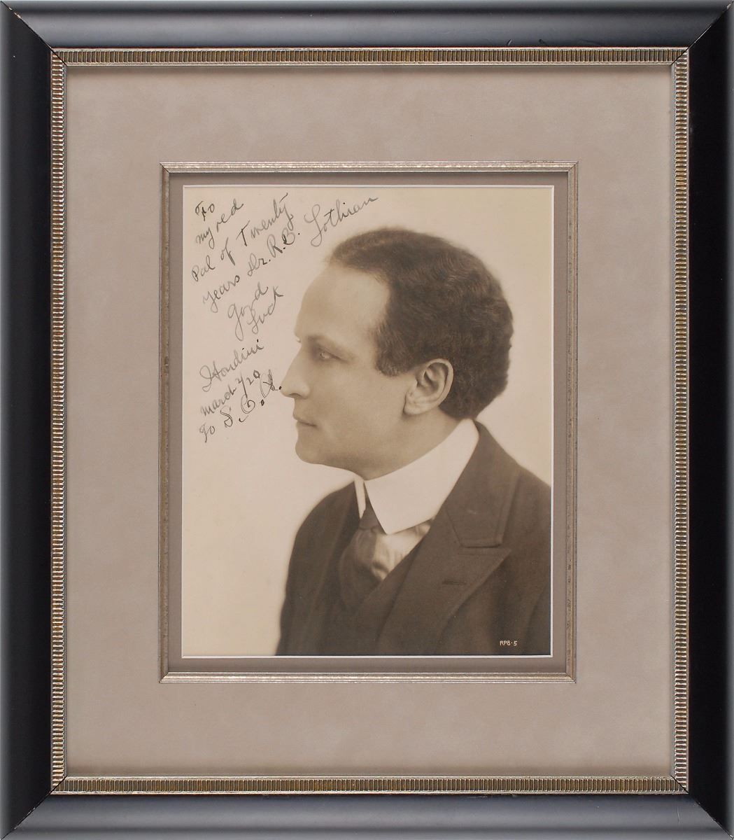 Splendid matte-finish 7.25 x 9.25 photo of Houdini in profile, signed and inscribed in fountain pen, “To my old Pal of Twenty years Dr. R. B. Lothian, Good Luck, Houdini, March 2/20, To S. G. A.” Handsomely double-suede-matted and framed to an overall size of 14.75 x 16.75. In fine condition. The recipient is probably Robert Bain Lothian, a prominent physician in Glasgow. Houdini toured the United Kingdom in 1920 as a part of his ongoing crusade to debunk beliefs in spirits and the occult. It was during March that he first met Arthur Conan Doyle, a staunch believer in spiritualism, with whom he formed a famous friendship. An absolutely exquisite portrait signed during an important period of Houdini’s career.
