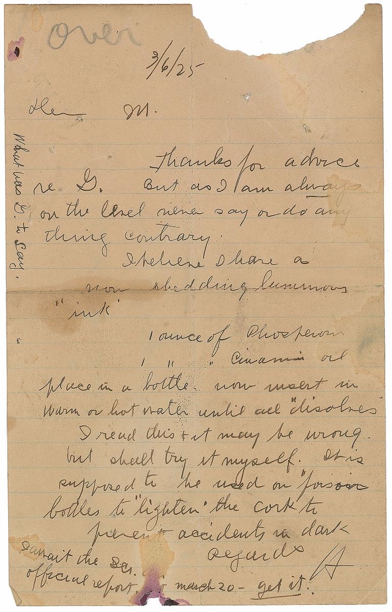 ALS signed “H,” one page, lightly-lined, 5 x 8, March 6, 1925. Letter addressed to “Dear M.,” notated on the reverse in an unknown hand as Ernest F. Mansfield. In full: “Thanks for advice re G. But as I am always on the level never say or do anything contrary. I believe I have a new shedding luminous ‘ink.’ 1 ounce of Phosperous [sic], 1 [ounce of] Cinnamon oil. Place in bottle, now insert in warm or hot water until all ‘dissolves.’ I read this and it may be wrong but shall try it myself. It is supposed to be used on poison bottles to ‘lighten’ the cork to prevent accidents in the dark.” Under his signature Houdini adds, “I await the Scr. Ans. official report out March 20—get it!,” as well as “What was G. to say,” along the left edge. In very good condition, with several pinholes to body affecting nothing. Accompanied by a full letter of authenticity from PSA/DNA.