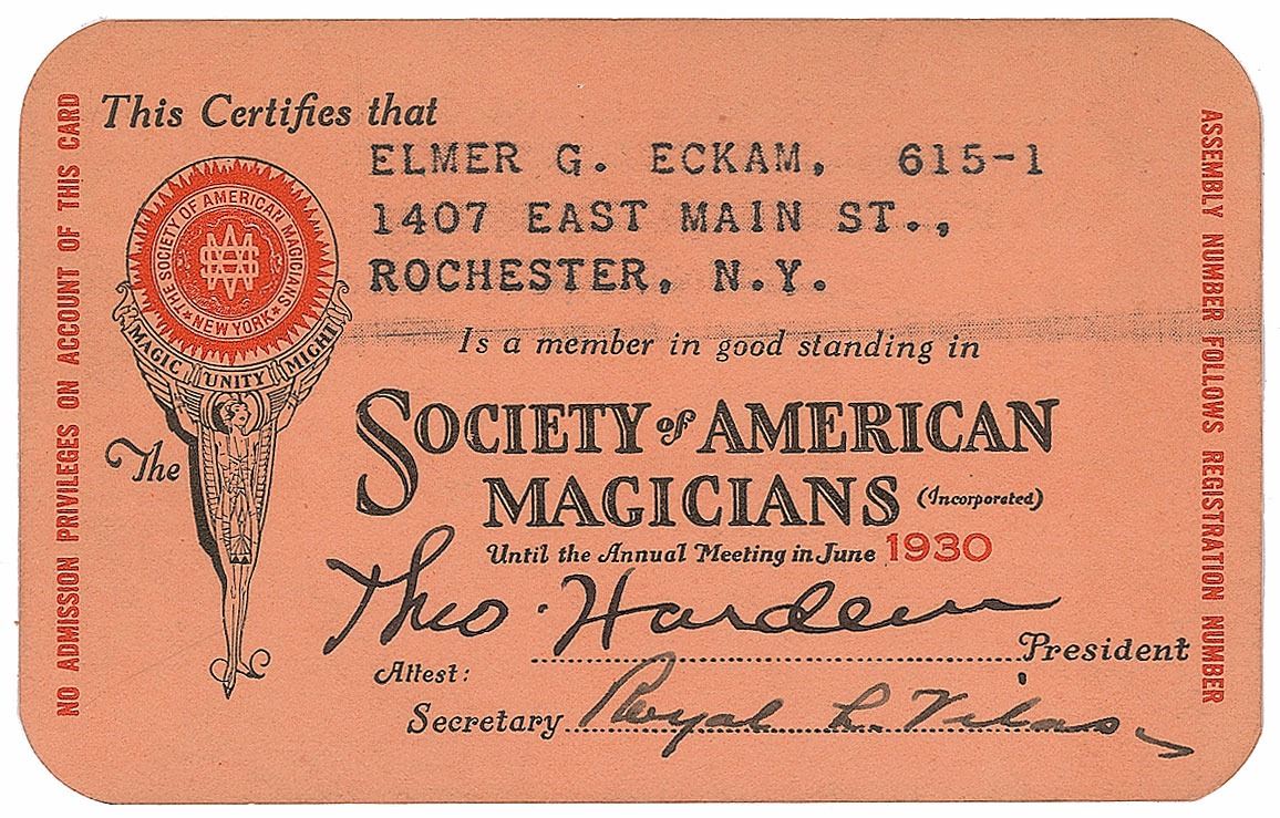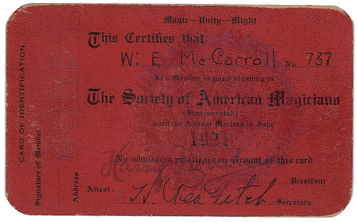 Society of American Magicians membership card, issued to W. E. McCarroll for the year 1921, 4 x 2.5, signed in black ink by Houdini as the society’s president. Also included is a 1930 membership card issued to Elmer Eckam, signed by president Theodore Hardeen. In very good condition, with Houdini’s signature very light, but still partially legible and some scattered edge wear. Hardeen was Harry’s younger brother who revived his own career after inheriting his late brother’s show.