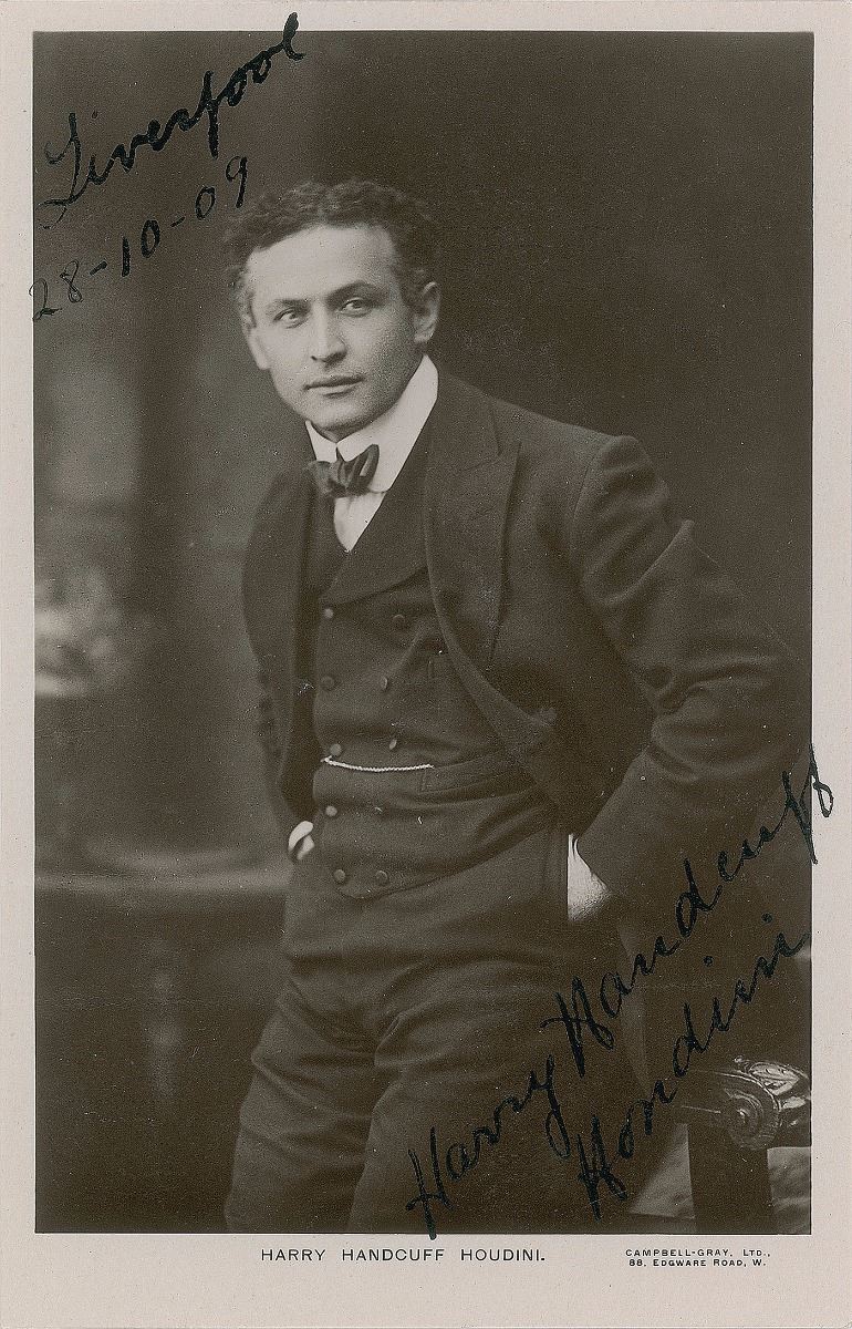 Remarkable vintage glossy 3.5 x 5.25 Campbell–Gray postcard photo of the master magician with his hands in his pockets, signed at the top in black ink, “Liverpool, 28–10–09,” and below, “Harry Handcuff Houdini.” In fine condition, with old mounting remnants to the reverse.