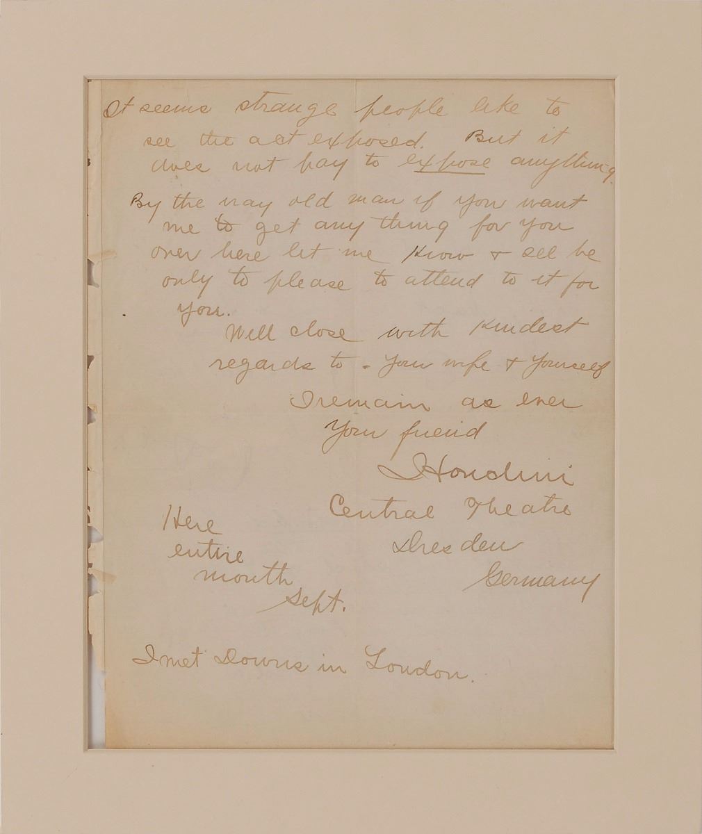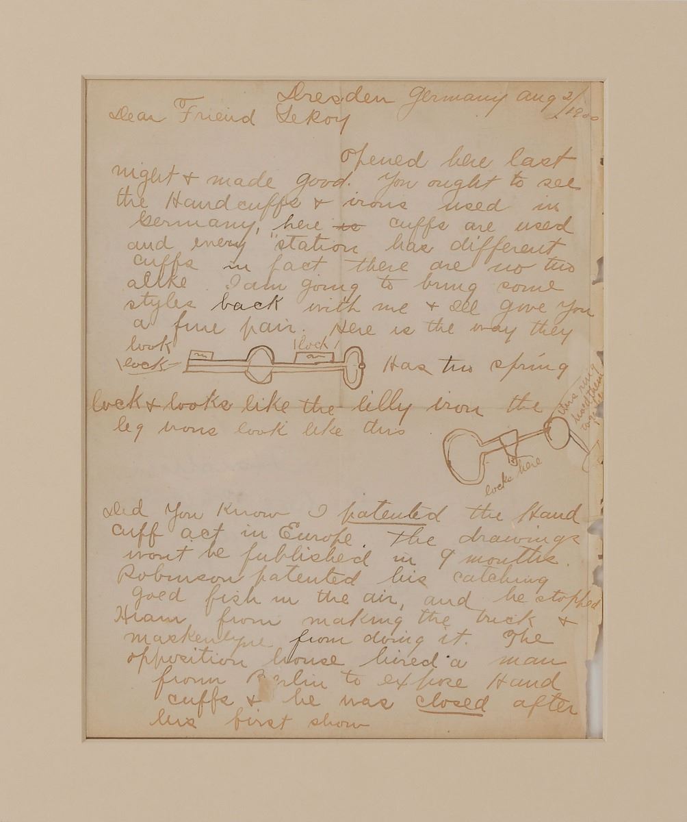 ALS signed “Houdini,” one page on two adjoining sheets, 8.75 x 11.25, August 2, 1900. Letter to fellow magician Servais Le Roy. In part: “Opened here last night & made good. You ought to see the Handcuffs & irons used in Germany. Here cuffs are used and every station has different cuffs, in fact there are no two alike. I am going to bring some styles back with me & I'll give you a fine pair. Here is the way they look [sketch of the handcuffs]. Has two spring lock & looks like the lilly iron the leg irons look like this [sketch]. Did you know I patented the Hand cuff act in Europe, the drawings won’t be published in 9 months. Robinson patented his catching gold fish in the air, and he stopped Hiam from making the trick and Maskeleyne from doing it. The opposition house hired a man from Berlin to expose Hand cuffs & he was closed after his first show. It seems strange people like to see the act exposed. But it does not pay to expose anything.” Matted and in fine condition, with chipping along the right edge affecting one word of text.