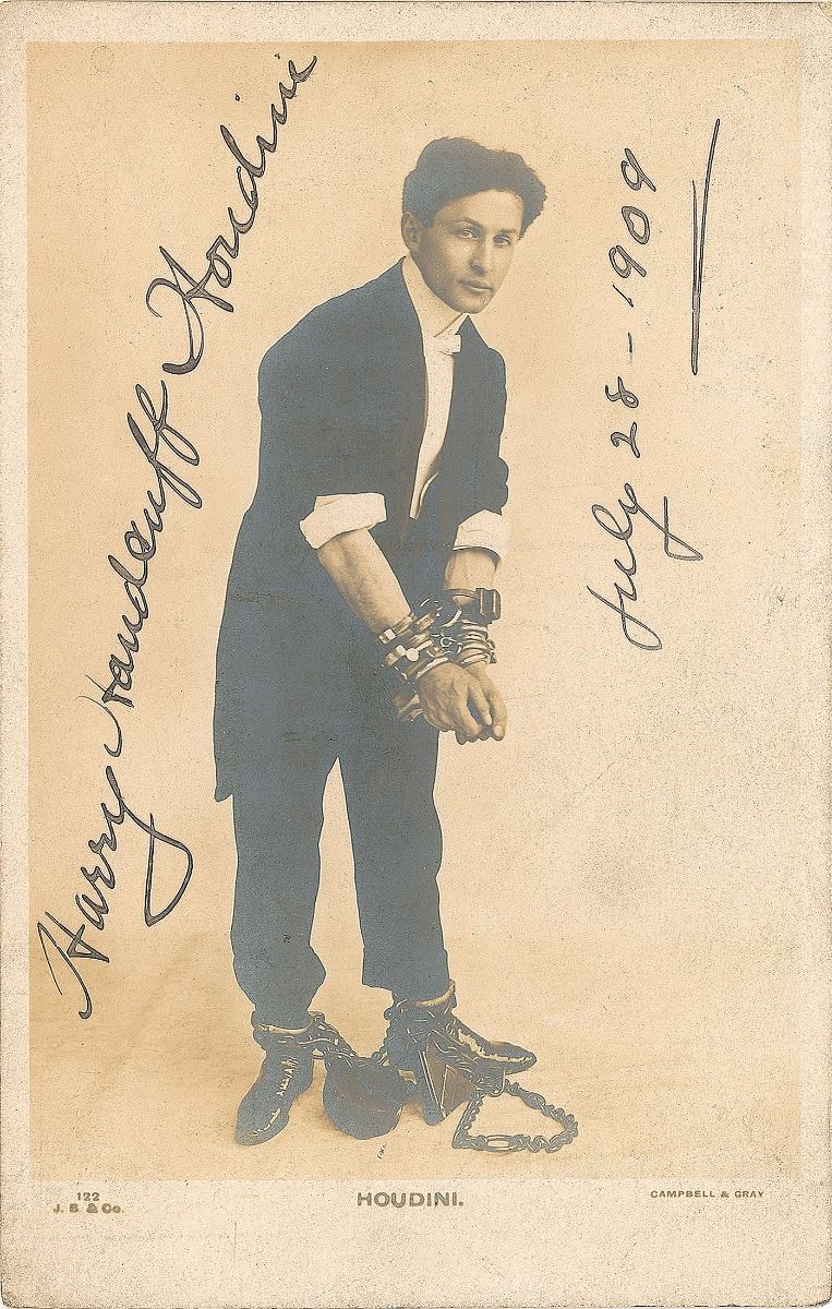 Ideal vintage matte-finish 3.5 x 5.5 postcard photo of the manacled magician by J. Beagles and Co. of London, signed vertically in fountain pen, “Harry Handcuff Houdini, July 28—1909.” In fine condition, with slight silvering to darker areas of the image. The year of 1909 proved an especially hectic one for Houdini, who published his second book, Handcuff Secrets, debuted in his first feature film, Marvelous Exploits of the Famous Houdini in Paris, and took his passion for aviation to new heights, purchasing a French Voisin biplane and making his first successful flight in Hamburg in late November. An iconic image of history’s most famous magician.