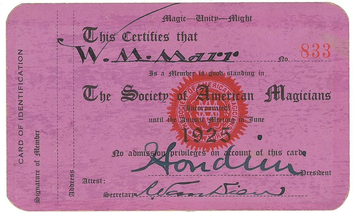 Society of American Magicians membership card issued to W. M. Marr for 1924-1925, 4 x 2.5, boldly signed at the bottom in fountain pen by Houdini as president, “Houdini,” and countersigned by Richard van Dien as secretary. In fine condition, with a few old mounting remnants on the reverse.