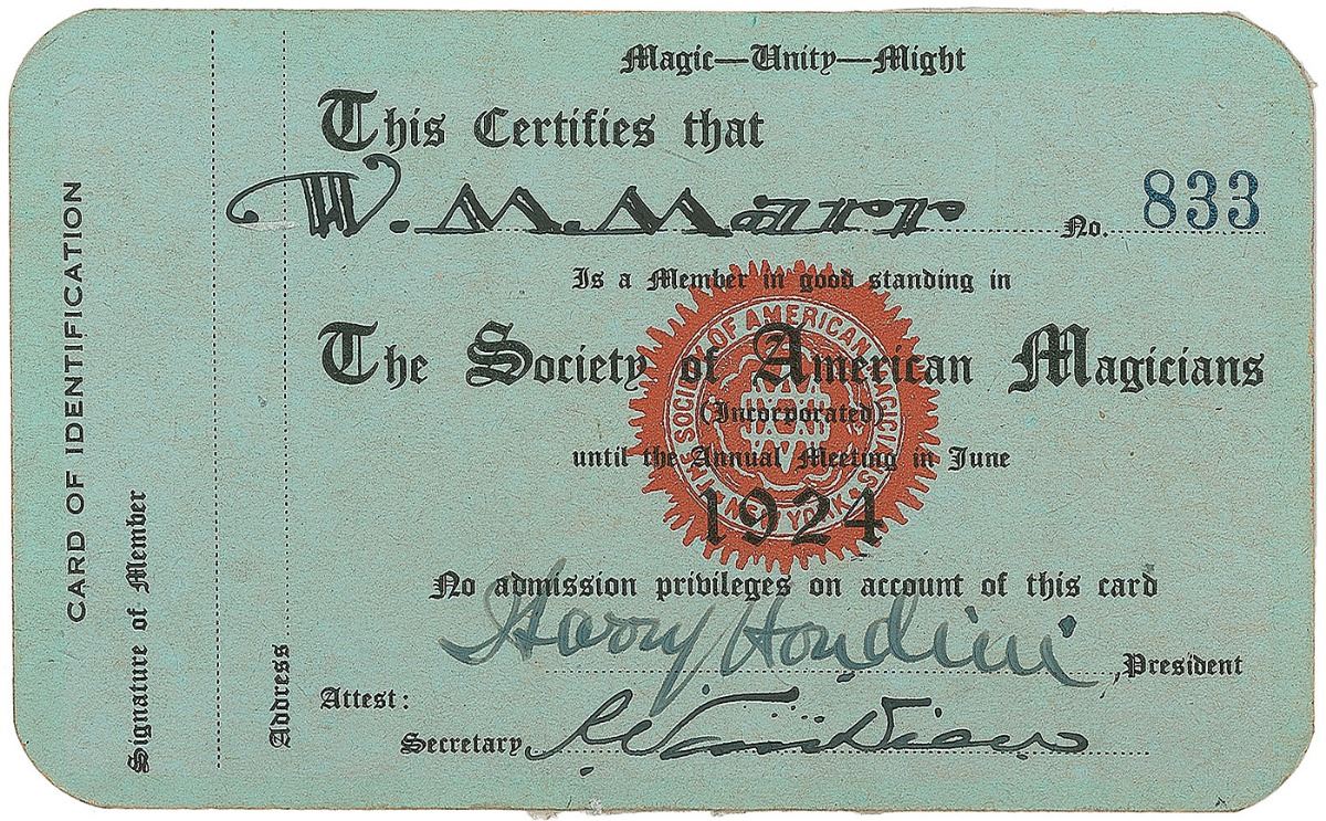 Society of American Magicians membership card issued to W. M. Marr for 1923-1924, 4 x 2.5, signed at the bottom in fountain pen by Houdini as president, and countersigned by Richard van Dien as secretary. In fine condition, with tape remnants to reverse. Founded on May 10, 1902, in the back room of Martinka's magic shop in New York, the Society expanded under the leadership of Harry Houdini during his term as National President from 1917-1926.