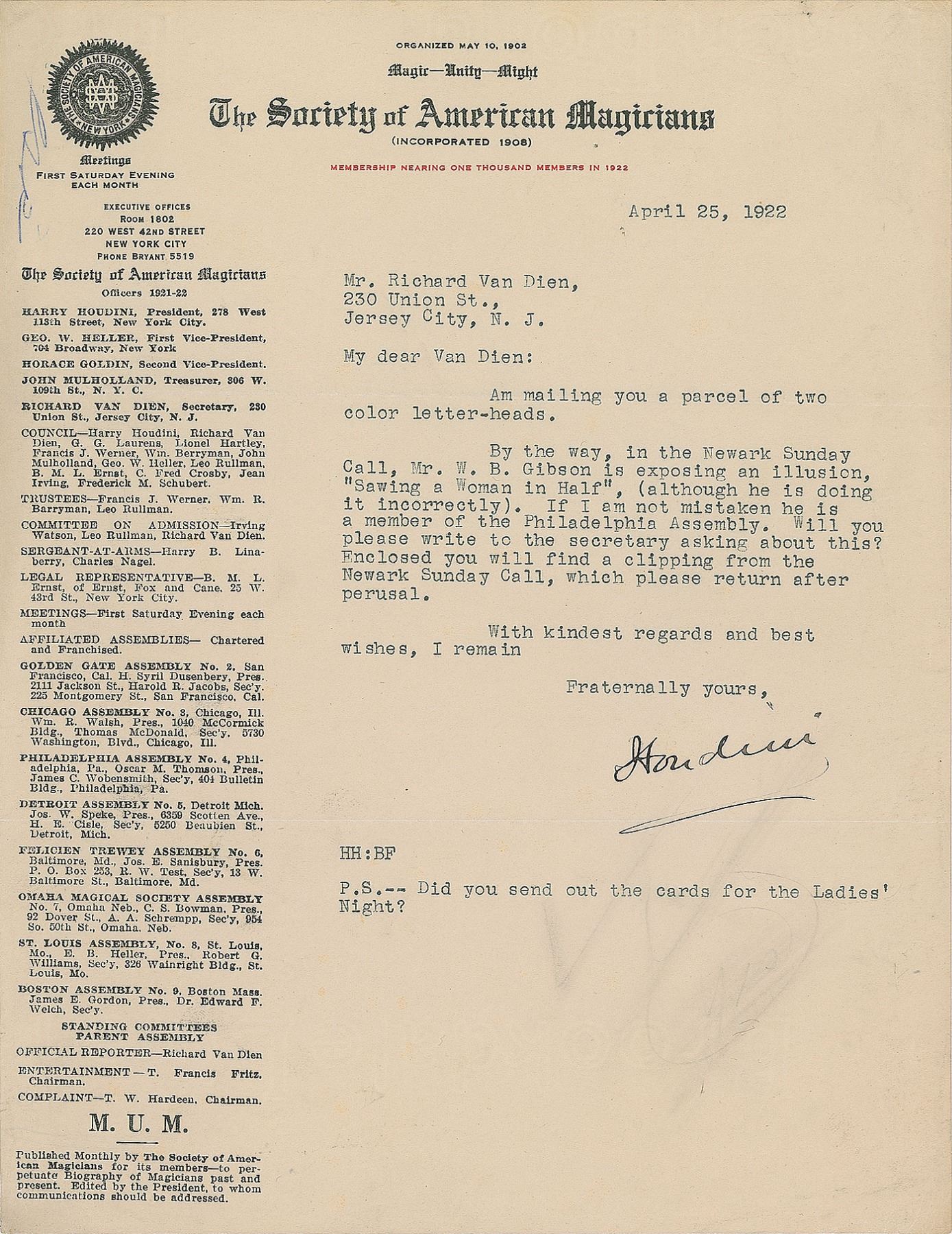 TLS signed “Houdini,” one page, 8.5 x 11, The Society of American Magicians letterhead, April 25, 1922. Letter to Richard Van Dien, in full: "Am mailing you a parcel of two color letter-heads. By the way, in the Newark Sunday Call, Mr. W. B. Gibson is exposing an illusion, 'Sawing a Woman in Half,' (although he is doing it incorrectly). If I am not mistaken he is a member of the Philadelphia Assembly. Will you please write to the secretary asking about this? Enclosed you will find a clipping from the Newark Sunday Call, which please return after perusal." Houdini adds a brief postscript: "Did you send out the cards for the Ladies' Night?" In fine condition, with slight wrinkling and ink marks to upper portion.