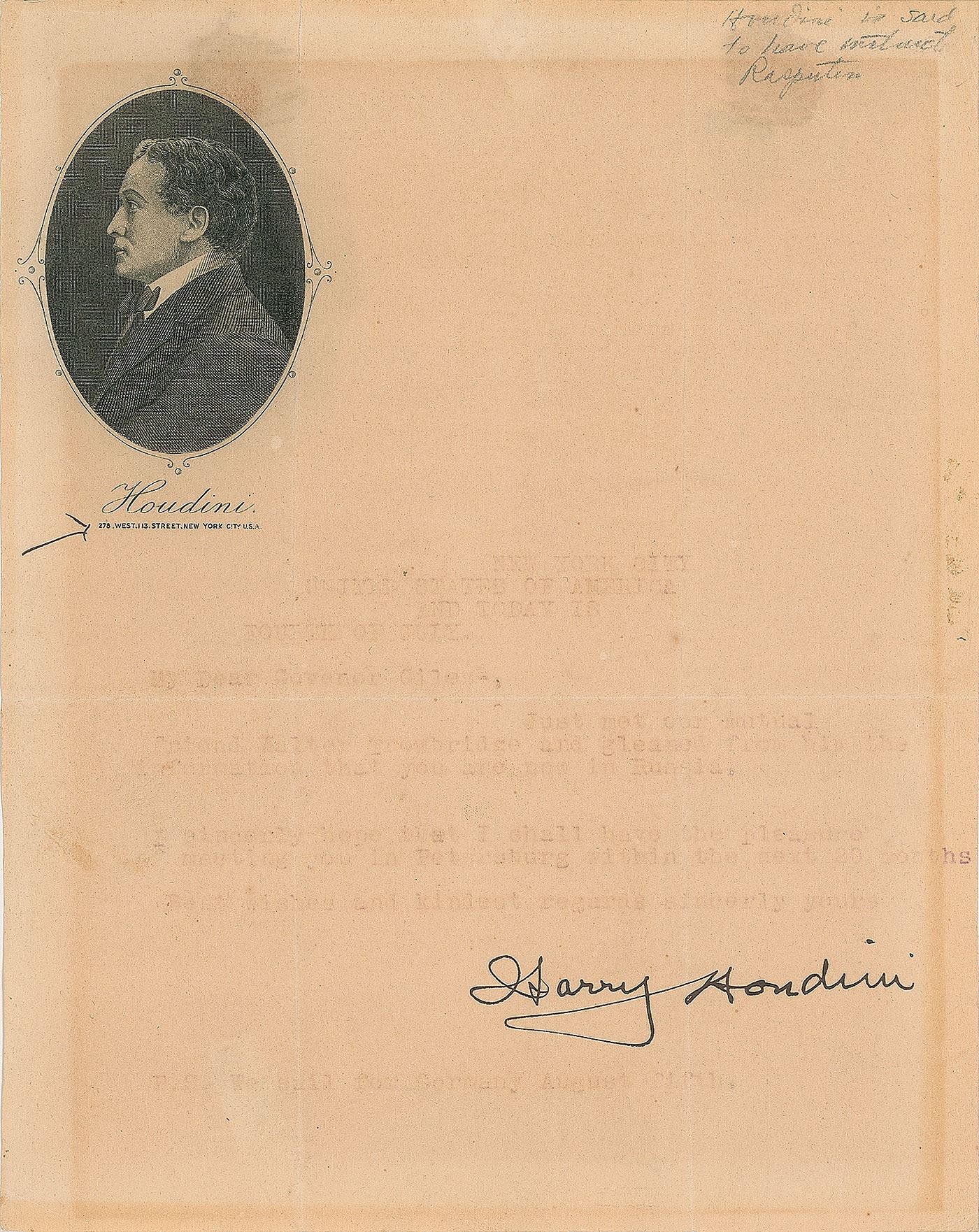 TLS, one page, 7.25 x 9, personal letterhead, July 4, no year. Letter to Governor Giles, in full: "Just met our mutual friend Walter Trowbridge and gleaned from him the information that you are now in Russia. I sincerely hope that I shall have the pleasure of meeting you in Petersburg within the next 20 months. Best wishes and kindest regards sincerely yours." Houdini adds a postscript: "We sail for Germany August fifth." Affixed to a slightly larger foamcore mount. In very good condition, with overall toning, two light stains at the top from old mounting residue on the reverse, and all of the type extremely faded; the signature, in contrast, is exceedingly bold.