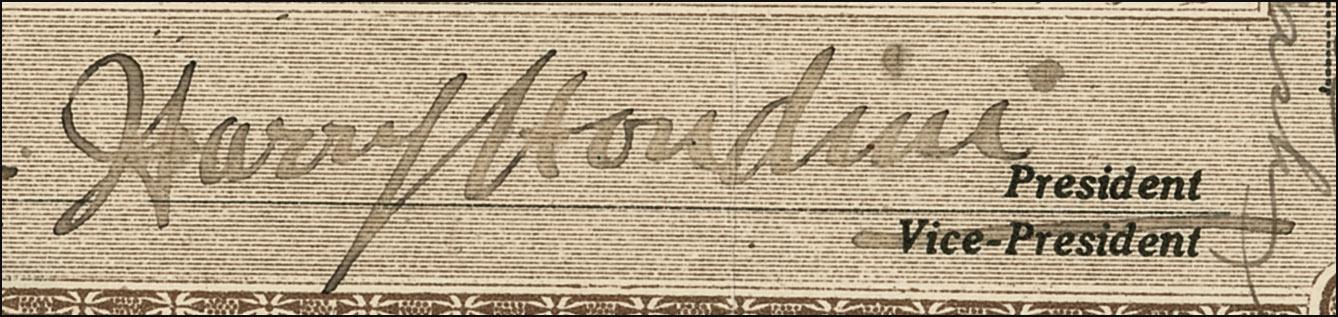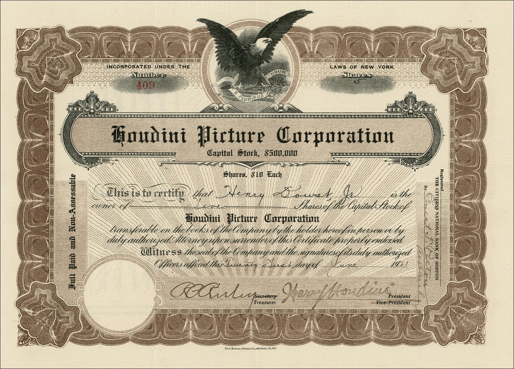 Partly-printed DS, one page, 11.5 x 8.25, June 1, 1921. Stock certificate issued to Henry Doust, Jr., for five shares of capital stock in the Houdini Picture Corporation, signed at the bottom in black ink by Houdini as president of the company. Two vertical folds, one through a single letter of signature, staple hole to top corners some light creasing, and Houdini’s signature a shade light, otherwise fine condition. Following his two-picture stint in Hollywood, Houdini returned to New York and started his own film production company called the Houdini Picture Corporation. He produced and starred in two films, The Man from Beyond and Haldane of the Secret Service. Houdini would give up the picture business in 1923. Pre-certified PSA/DNA and RRAuction COA.