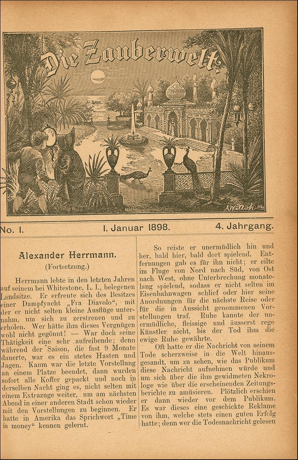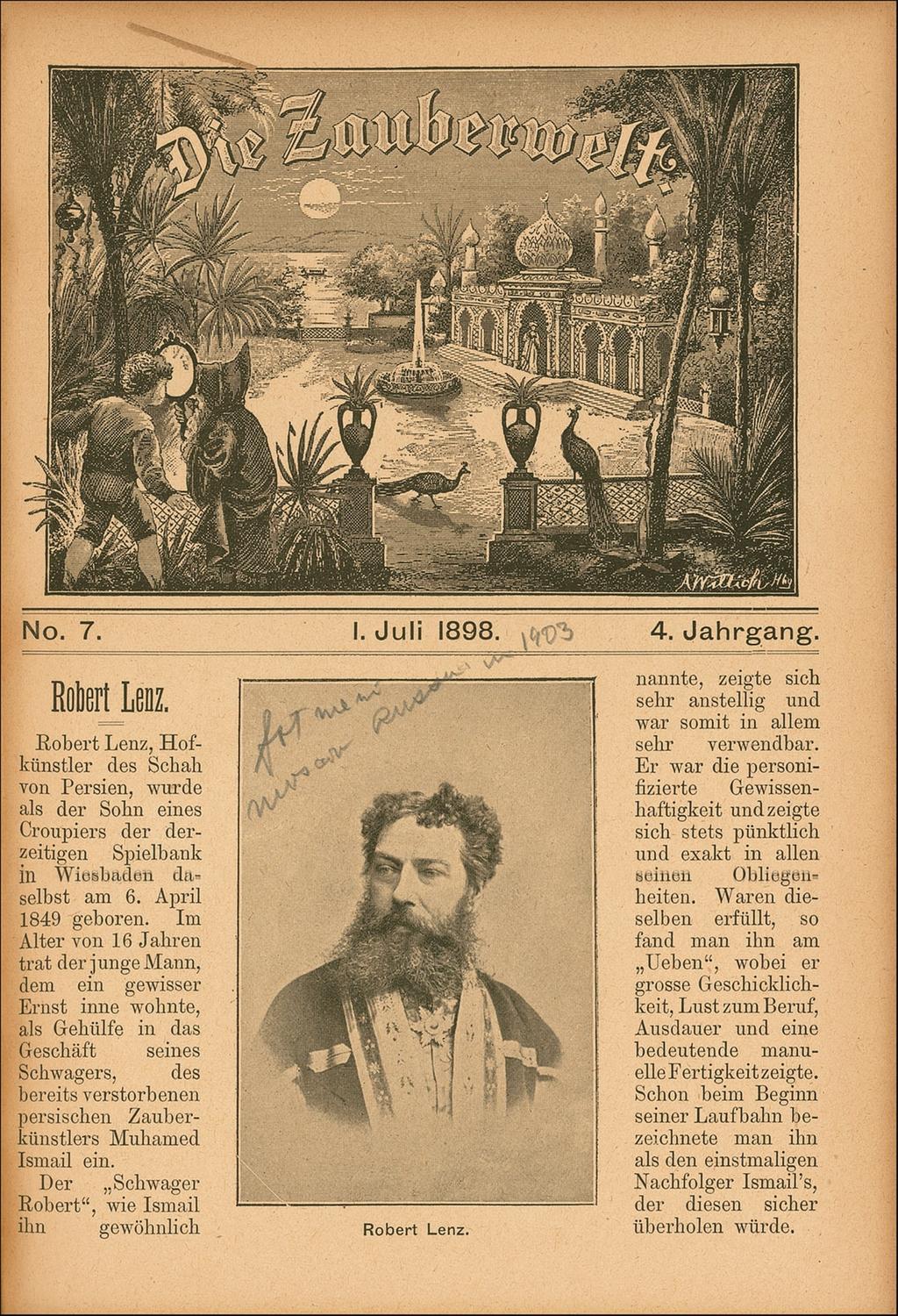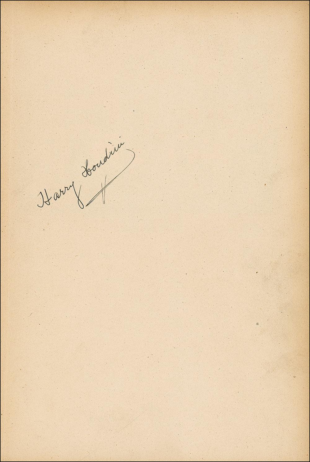 Signed book: Die Zauberwelt. 1898. Hardcover, 6.25 x 9, 192 pages. Signed “Harry Houdini” in fountain pen on the second free end page. Die Zauberwelt translates as ‘The Magic World,’ and this appears to be a bound volume of several German magic magazines. References are made to Alexander Herrmann and several other magicians, and the pages are filled with illustrations of props and techniques. Interior pages are uniformly toned from age, but the page signed by Houdini is quite clean. The front cover is detached and the leather covering the spine has peeled off, otherwise very good condition. Interestingly, above a photo of Robert Lenz on page 97, Houdini has added a pencil notation: “Let me in news on Russians in 1903.” This small note, along with the well-thumbed nature of the volume leads us to believe that the signature in the front is probably an ownership signature, and that this book was likely part of Houdini’s vast magic library.