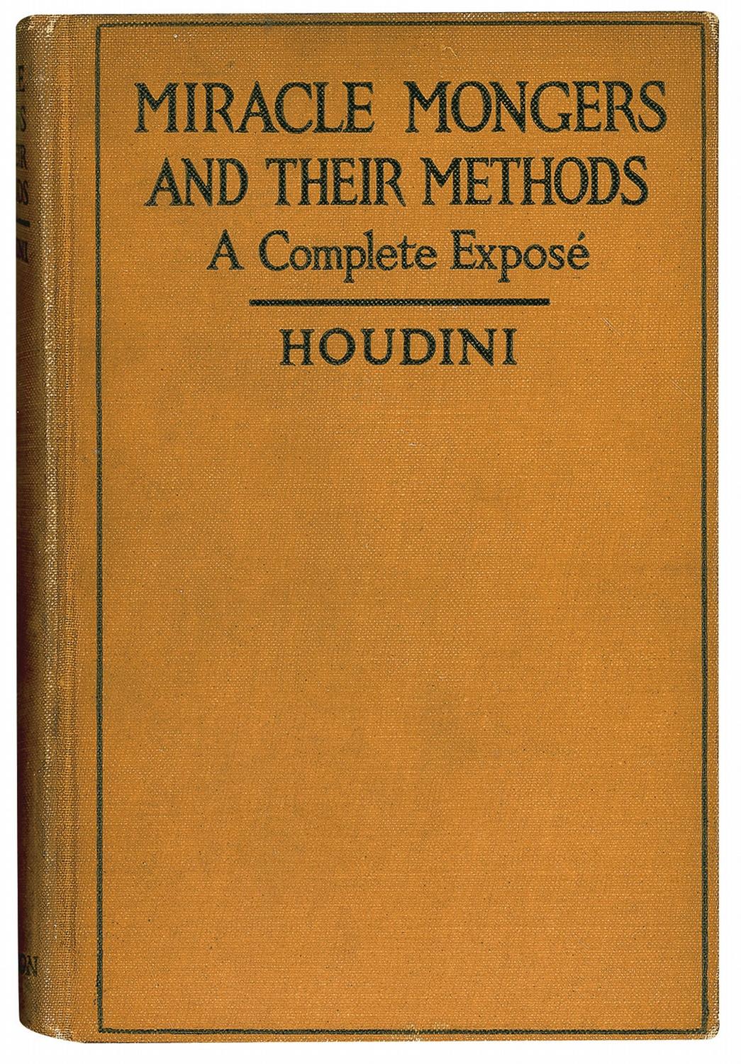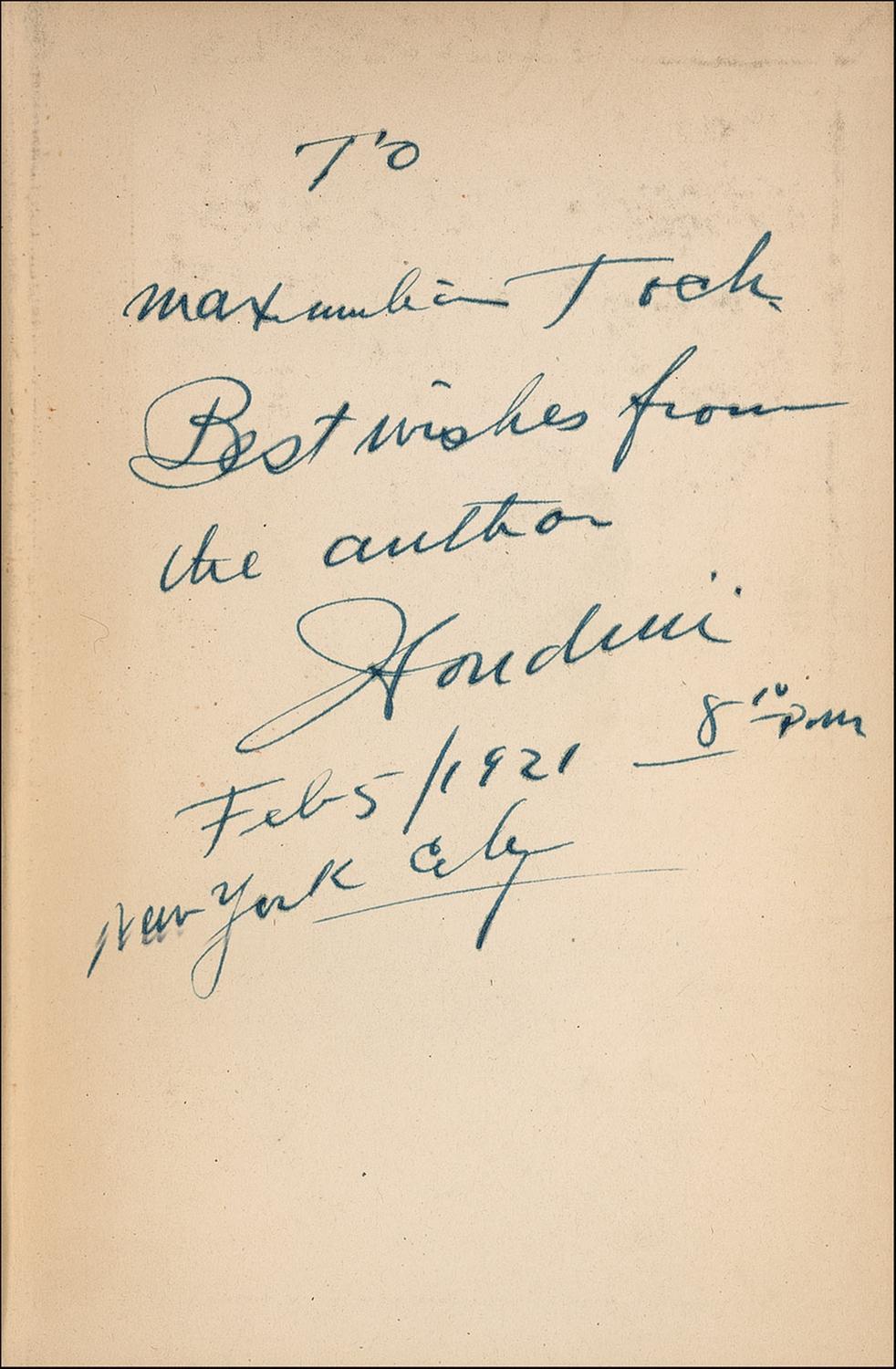 Signed book: Miracle Mongers and Their Methods: A Complete Expose. NY: E. P. Dutton & Company, 1920. Hardcover, 5.5 x 8.25, 240 pages. Signed and inscribed on the first free end page, “To Maximilian Toch, Best wishes from the author, Houdini, Feb 5/1921, 8:10 pm, New York City.” In very good to fine condition, with scattered soiling to signed page and pastedowns, uniform mild toning to inside pages, and scattered wear and soiling to covers and spine (soiling heavier to spine).