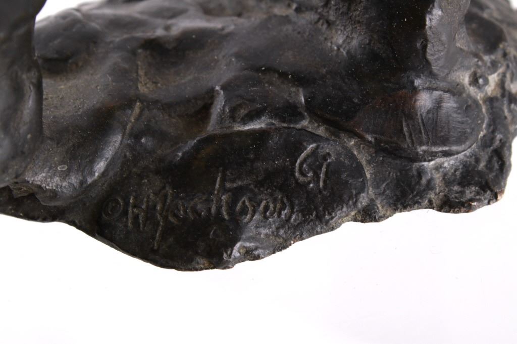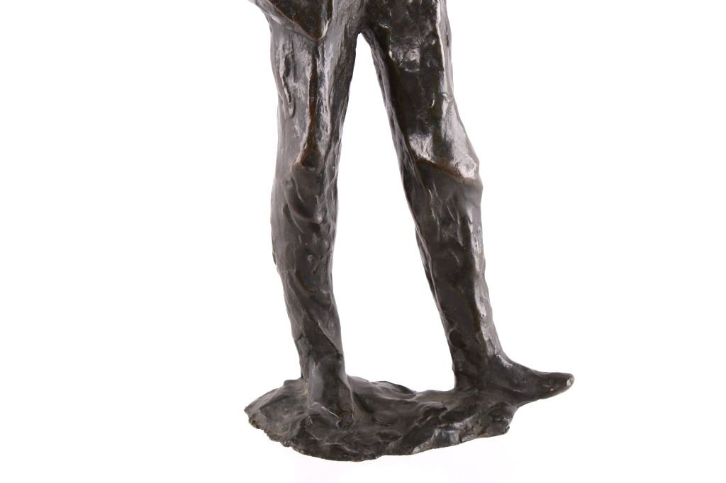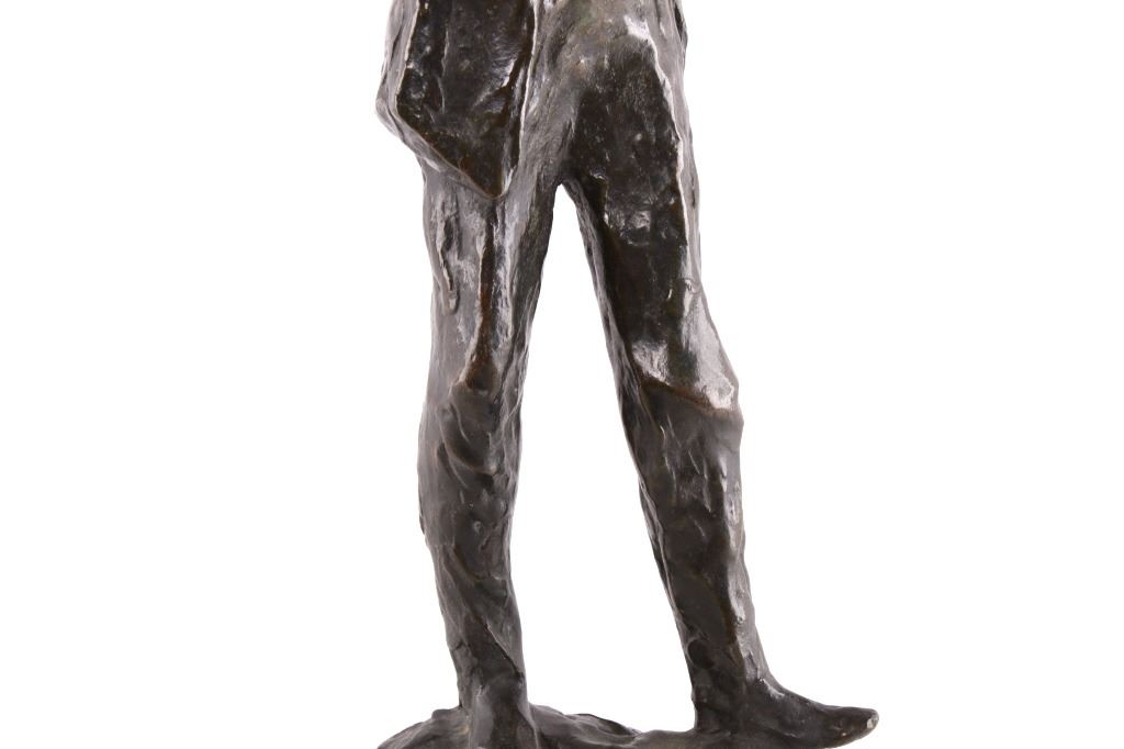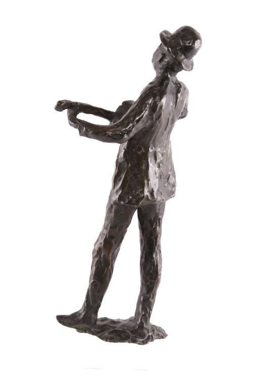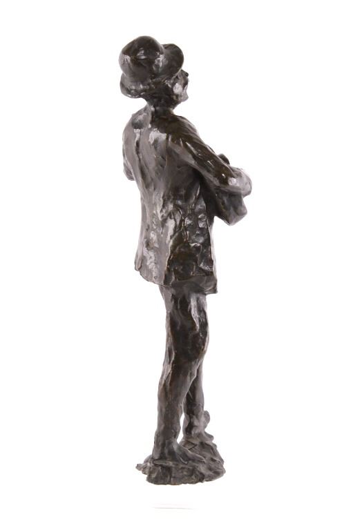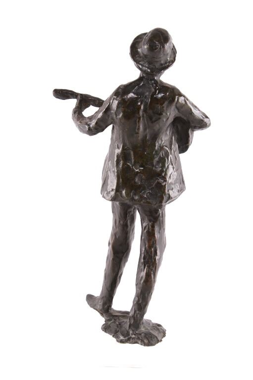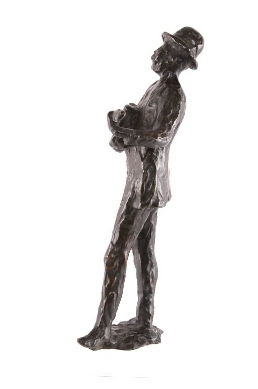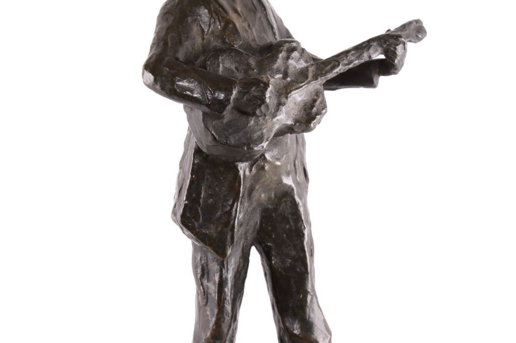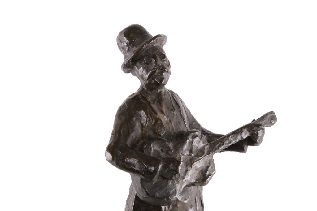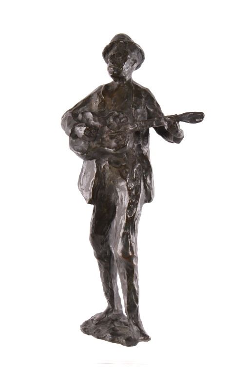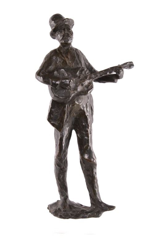 Featured in this lot is a bronze sculpture called "Man With Guitar" circa 1961, by artist Harry Jackson who was born 1924 and died in 2011. The sculpture is a wonderfully and professionally crafted bronze construction that shows a man playing a guitar and wearing a bowl hat cocked to the side. The bronze is marked as follows: H. Jackson - 61. Harry Andrew Jackson (April 18, 1924 – April 25, 2011). Harry Aaron Shapiro Jr., was an American artist. He began his career as a Marine combat artist, then later worked in the abstract expressionist, realist, and American western styles. The condition of this bronze sculpture is good with no obvious sings of damage and shows good overall condition. The measurements of this bronze are 16" x 7 1/2" x 4 1/2".*