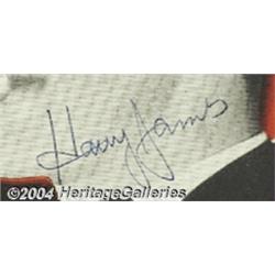 <B>Harry James Signed Window Card.</B></I> Harry James was born into music, as his father was the bandleader for travelling circuses. At seven, Harry was playing the drums and, by the time he was ten, his father was teaching him trumpet. From 1935-1936, Harry got a road gig with Ben Pollack's big band, but in 1937, after joining Benny Goodman, Harry James would become a superstar. His trumpet solos became a favorite among Goodman's fans, and James soon decided to go off on his own to form a band under his own name, which he did in 1939. Harry James, with movie star good looks, appeared in many films, such as "Private Buckaroo," "Springtime in the Rockies," "Best Foot Forward," and "Two Girls and a Sailor," plus he played trumpet on the soundtrack for actor Kirk Douglas in the film "Young Man With a Horn." This attractive card shows James with his trumpet, and he has signed on his image. Pinholes could be matted or framed out. <I>Accompanied by COA from Jazz & Big Band expert Larry Rafferty.</B></I> <BR><BR><B>Important notice:</B> Heritage usually auctions material at the rate of 200-250 lots per hour. On some occasions eBay Live bid software or the Internet may not be able to keep up with the pace of the auction. We recommend placing a realistic absentee bid now as insurance to avoid disappointment. Occasionally the auctioneer may eliminate or reject an eBay Live bid, and the auctioneer may also reopen a lot after the close of the eBay live bidding (usually because we missed an audience bid), and may reject your bid even if it shows you as the winning bidder. By bidding via eBay Live, you agree that Heritage may award the lot to another bidder at its sole discretion under the circumstances described above or any other reasonable circumstances. Since eBay bids are not shown to us until we open the lot on the floor, we treat those bids just like floor bids. In most cases the floor responds before the eBay bid is presented to us, due to Internet lag time, so for consistency we have made it a policy that floor bids are always considered first over tie eBay live bids. Also please note that all Heritage lots purchased through eBay Live carry a 24.5% Buyer's Premium. Please make sure you read the Terms and Conditions before you bid.