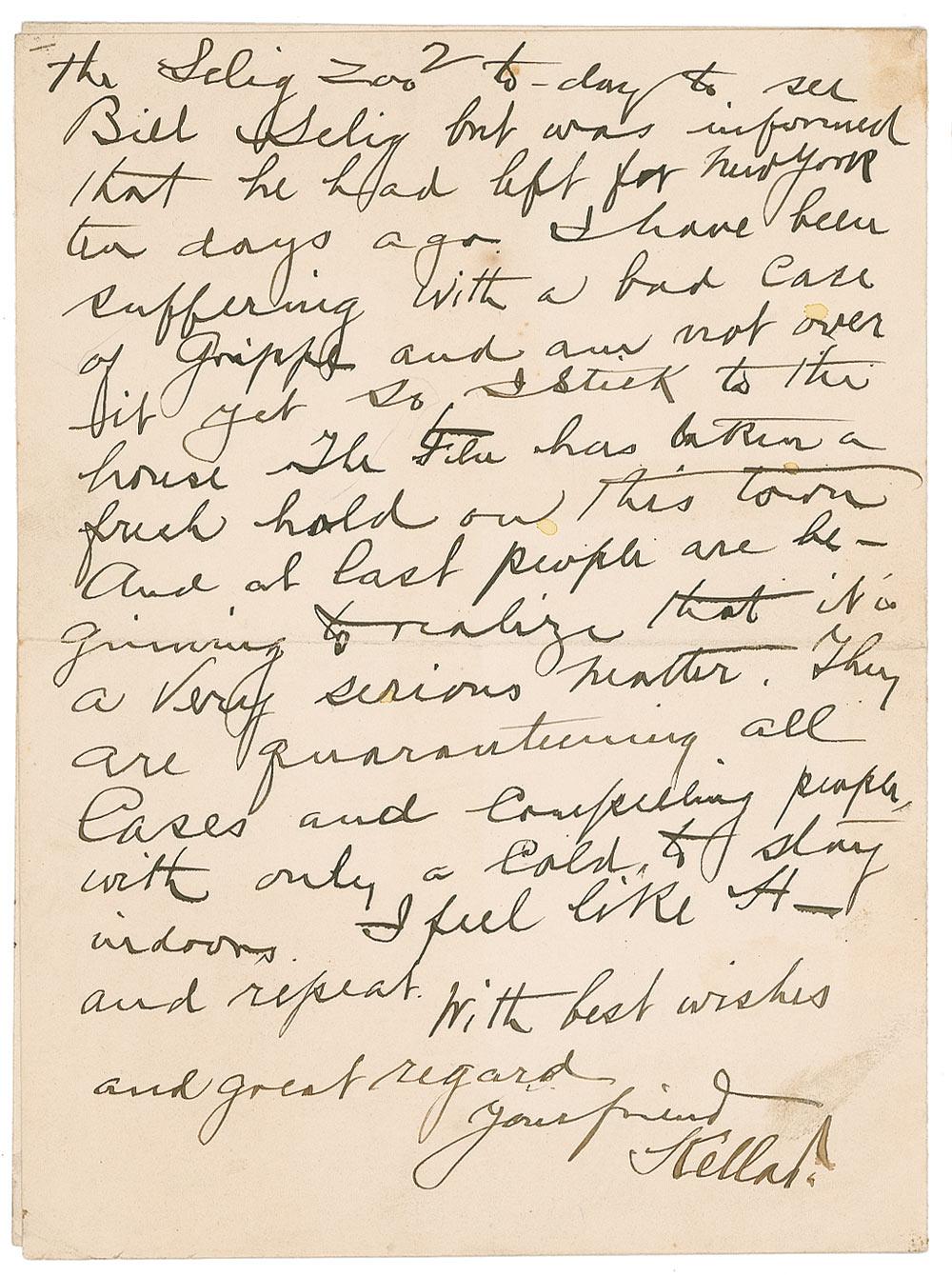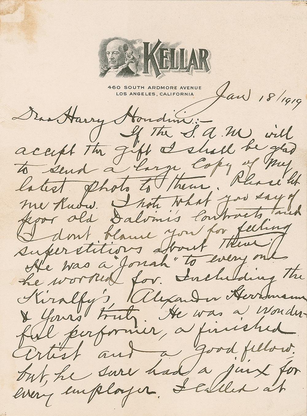ALS signed “Kellar,” two pages on two adjoining sheets, 5.75 x 8, elaborately designed pictorial personal letterhead showing Kellar with a devil whispering in his ear letterhead, January 18, 1919. Letter to Harry Houdini about the Society of American Magicians, contemporaries such as Thomas F. Manning (“Dalvini”) and the famous Alexander Herrmann (“Herrmann the Great”), as well as Houdini’s superstitious nature. In full: “If the S.A.M. Will accept the gift I shall be glad to send a large copy of my latest photo to them. Please let me know. I note what you say of poor old Dalvini’s contracts and I don’t blame you for feeling superstitious about them. He was a ‘Jonah’ to everyone he worked for. Including the Kiraflys, Alexander Herrmann, and yours truly. He was a wonderful performer, a finished artist and a good fellow, but, he sure had a jinx for every employer. I called at the Selig zoo today to see Bill Selig but was informed that he had left for New York ten days ago. I have been suffering with a bad case of Grippe and am not over it yet so I stick to the house. The Flu has taken a fresh hold on this town and at last people are beginning to realize that it is a very serious matter. They are quaranteeing all cases and compelling people with only a cold to stay indoors. I feel like H–” A few light brushes to text, and some scattered mild toning to second page and top of first page, otherwise fine condition.