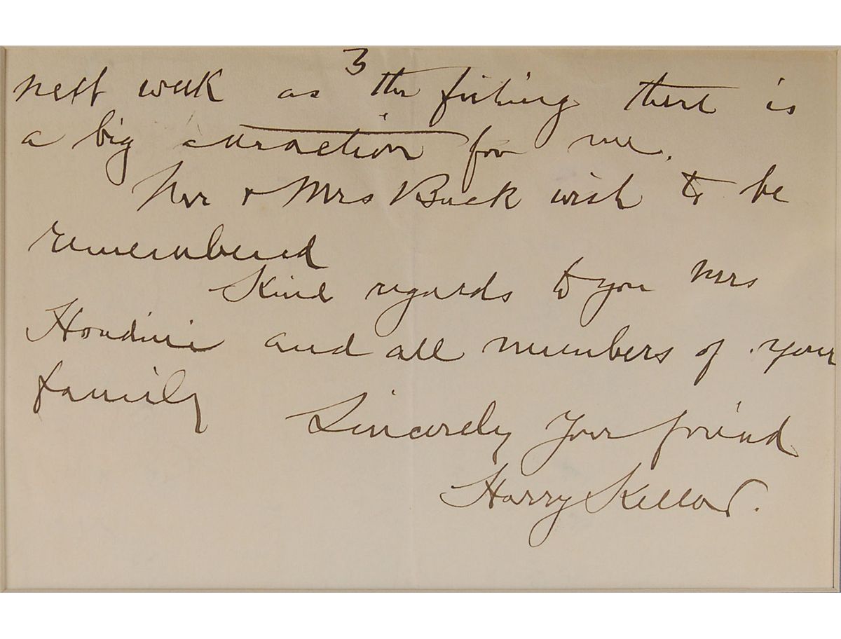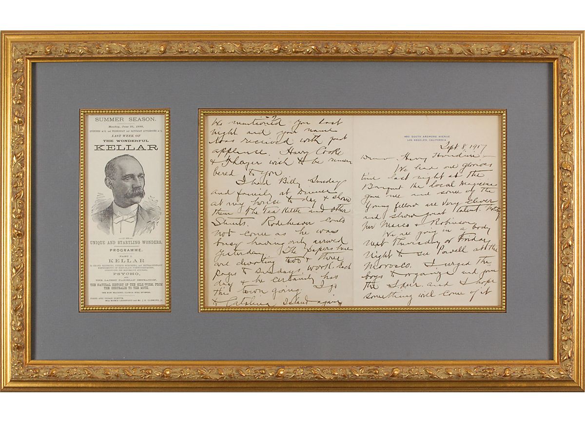 Prominent magician (1849–1922) known for his spectacular stage illusions. ALS, three pages on two adjoining sheets, 5.75 x 7.5, personal letterhead, September 8, 1917. Letter to Harry Houdini. In part: “We had one glorious time last night at the Banquet the local magazines gave me and some of the young fellows are very clever and show great talent…We mentioned you last night and your name was received with great applause. Harry Cooke & Thayer wish to be remembered to you. I had Billy Sunday and family at dinner at my house to day & showed them the Tea Kettle and other stunts…Kind regards to you Mrs. Houdini and all members of your family.” Attractively matted and framed beside an advertisement for Kellar’s show to an overall size of 23 x 14.5, with a window on the reverse so that the letter’s conclusion can be viewed. In fine condition. In addition to a being a piece of correspondence between two of the great illusionists of the era, Kellar mentions his lifelong friend Harry Cooke, who was the president of the Los Angeles Society of Magicians, and Floyd Thayer, founder of the Thayer Magic Company. Billy Sunday was a widely known professional baseball player-turned-evangelist preacher. A superb letter rife with excellent associations.