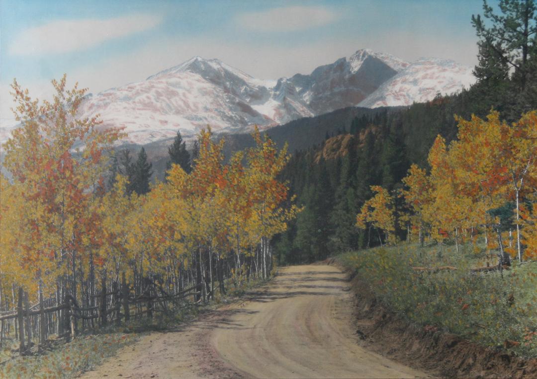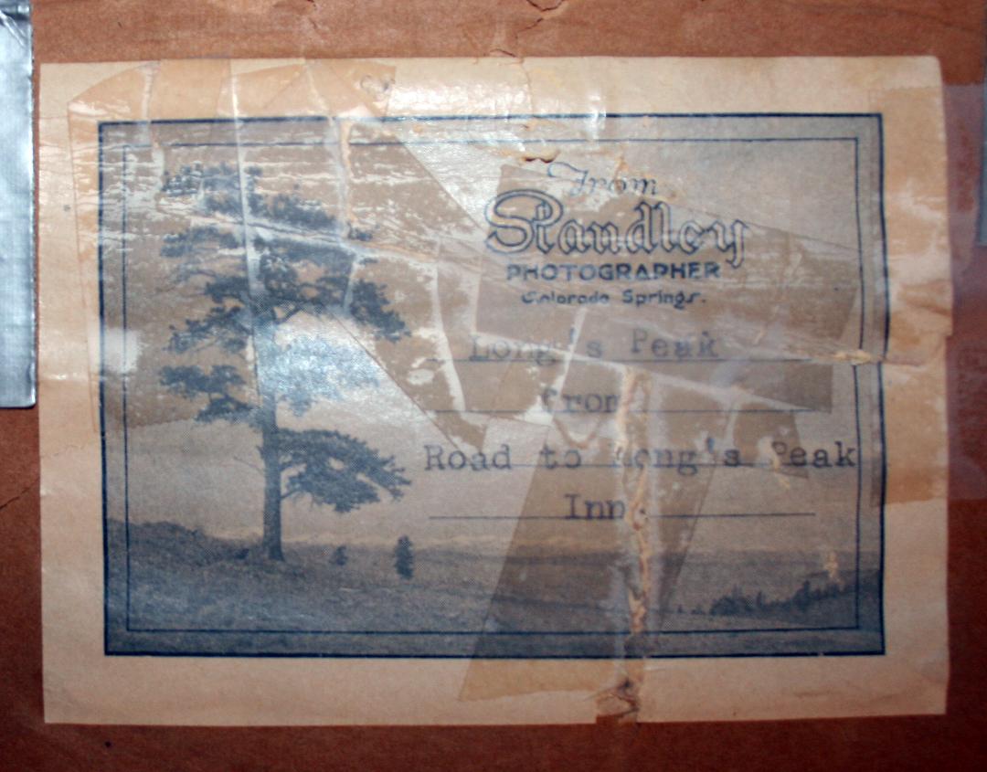 Harry Standley (1881-1951) Large vintage hand colored photograph. Photo size is 19.5"X29". Back of photo on matt is Standley studio photography label reading "Long's Peak from road to Long's Peak Inn". Large size in beautiful gold frame.