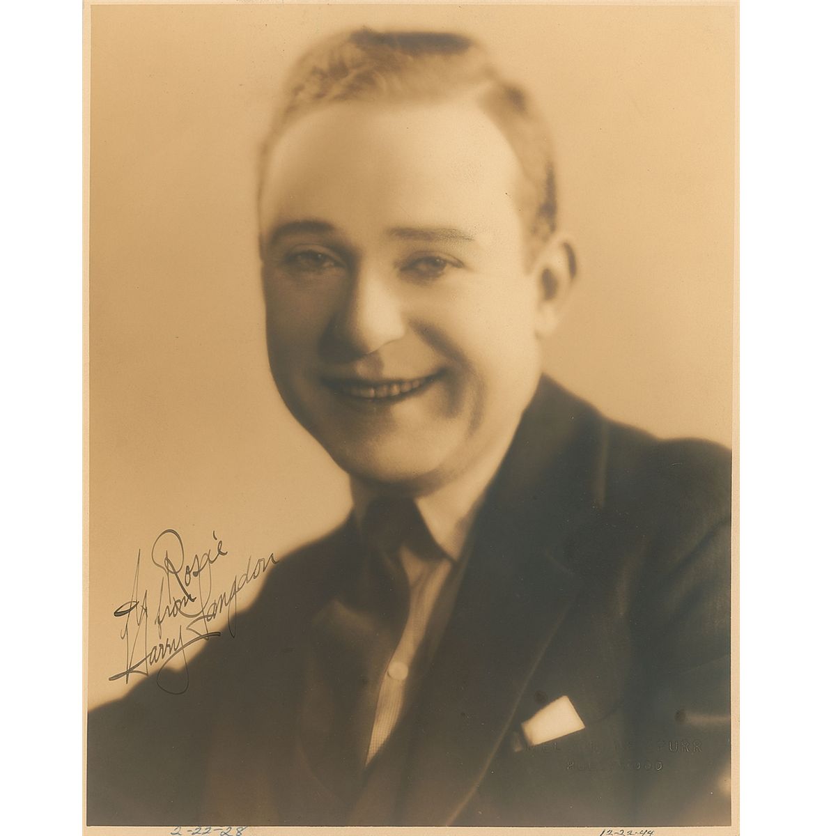 Vintage matte-finish 7.75 x 9.75 Melbourne Spurr portrait of Langdon, boldly signed and inscribed in fountain pen. Blindstamped in the lower right by Spurr. In fine condition, with tiny notations to borders and slightly trimmed edges.