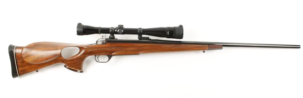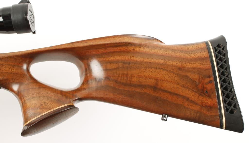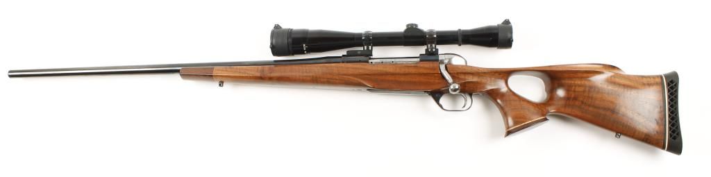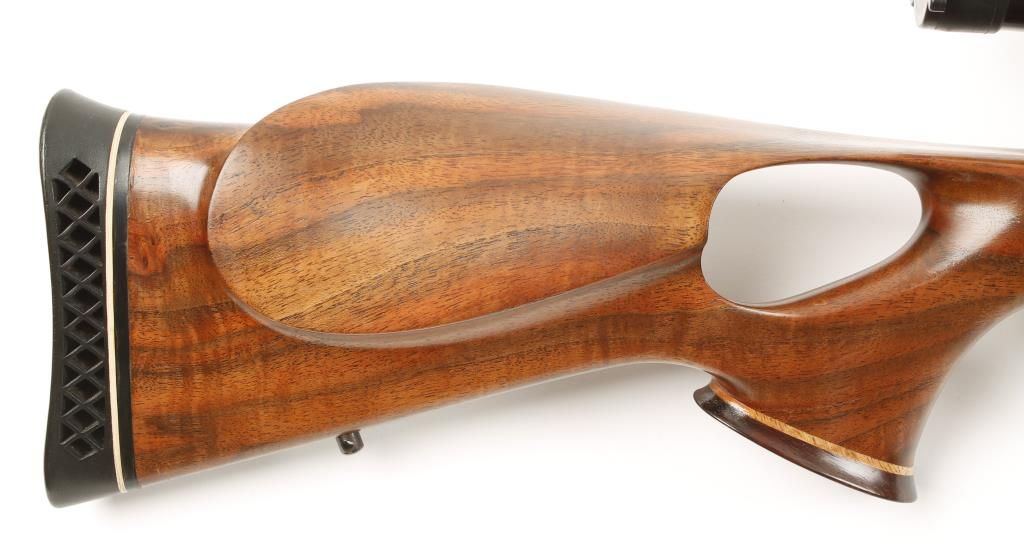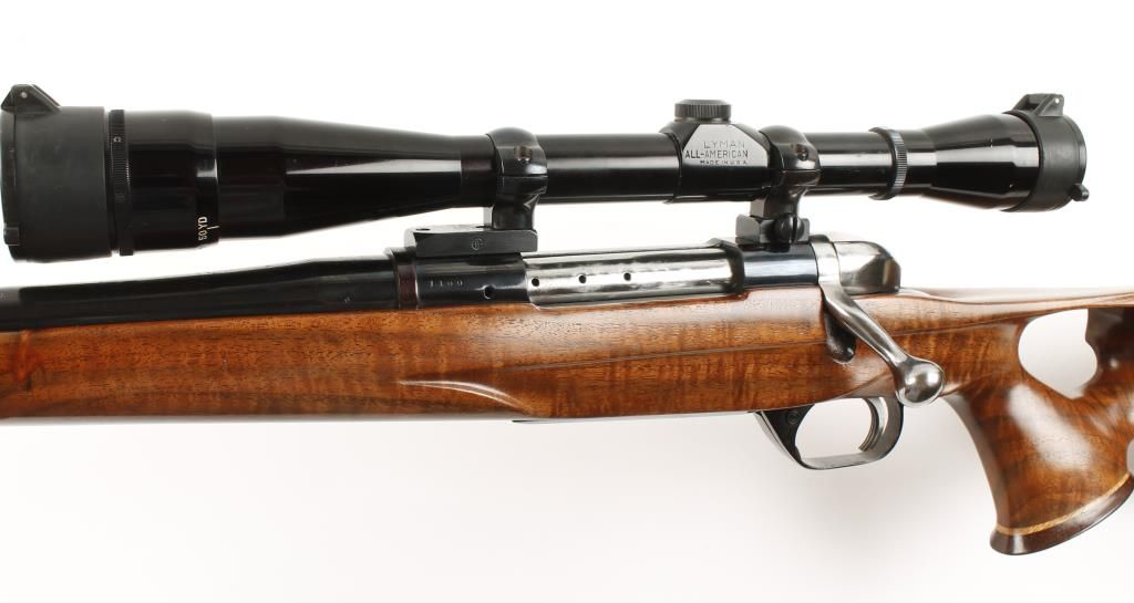Beautiful custom left hand bolt action rifle with 26" barrel. Blued finish, custom thumb hole stock with rosewood accents, black rubber recoil pad, hinged floor plate, sling swivel studs, no sights and fitted with Lyman All-American scope. Very good bore and action. Condition: Very good showing very light use. *Modern Firearm*