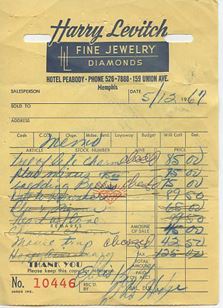 This is a single invoice from Harry Levitch Jeweler in Memphis, Tennessee dated 5-12-67 for jewelry paid for by Charlie Hodge on the account of Elvis Presley. This item comes with a Certificate of Authenticity guaranteed for the life of the piece.