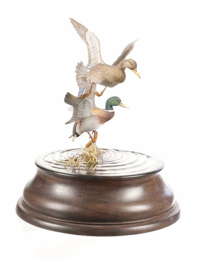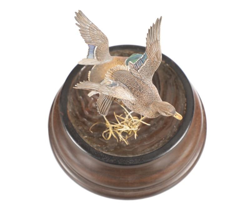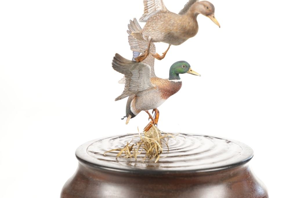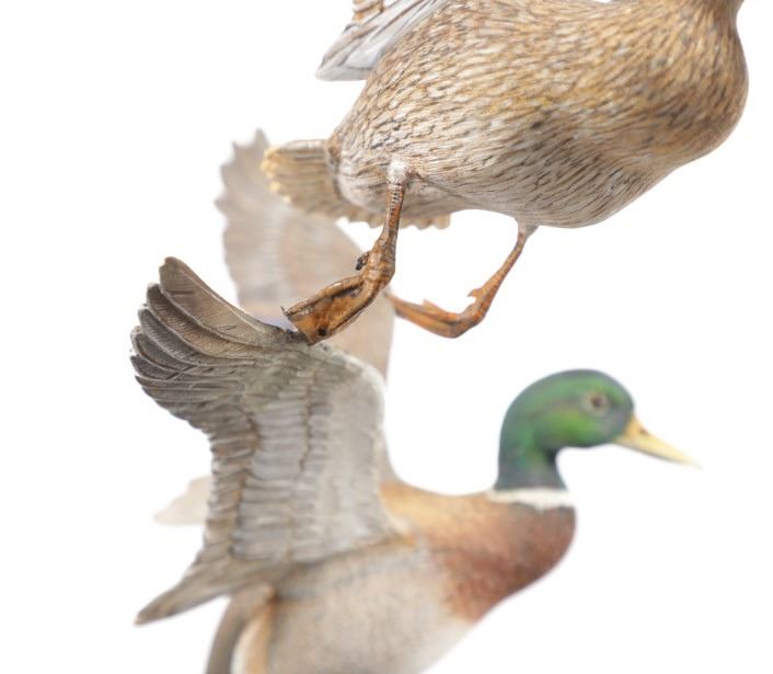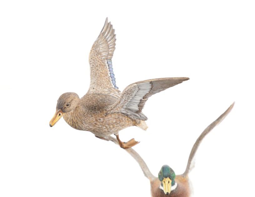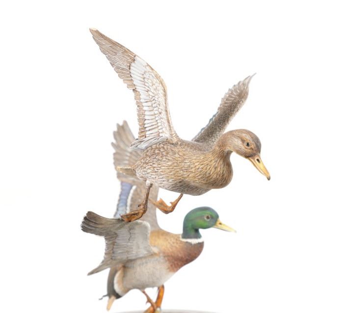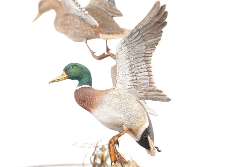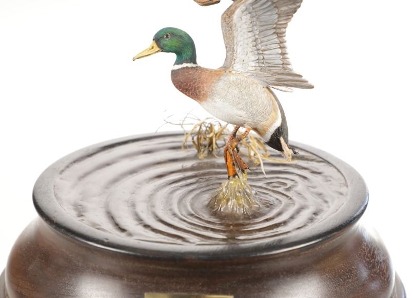 Featured in this lot is this mixed motive hand carved display of jumping mallards by artist Harry M. Vreeland born in 1908 and died in 1982. The display features a wonderfully and professionally crafted carved wooden and silica construction that shows a male and female mallard jumping and taking flight with life like characteristics all set to a stained hardwood base with a plaque that reads 'H. Vreeland.' Born in Syracuse, New York, Harry Vreeland spent most of his life working at Grumman Aerospace in Bethpage Beach. He later retired in 1972 after a long career as the chief engineer pf the antisubmarine division. In the same fashion as A.J. King, Vreeland began producing pairs of ducks and upland game birds starting in 1945, and continuing throughout his career at Grumman. Beginning in 1958 The Crossroads of Sports in New York City began to sell Vreeland’s miniature bird carvings, which they came to rely heavily on for their high market value. His work was noted for its high quality of painting, which was later in the 1960’s attributed to his wife Norma. The Vreeland’s continued to produce highly detailed miniature birds throughout their travels to South Yarmouth in Cape Cod, and Vero Beach, Florida during their retirement. The condition of this hand carved display is is well preserved condition with a slight malfunction to the connecting foot of the male mallard and some chipping to the wings of the female mallard but otherwise shows well preserved overall condition. The measurements of this display is 12" x 9 1/4" x 9 1/4". The collective weight of this display is 4lb 4oz.