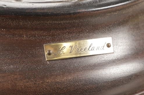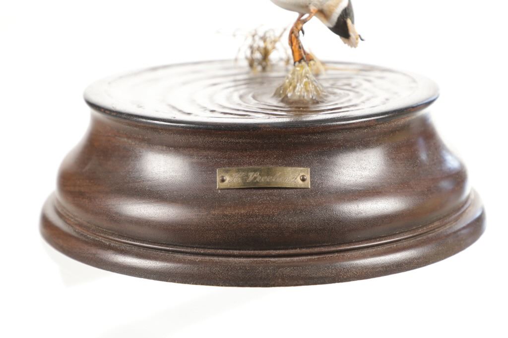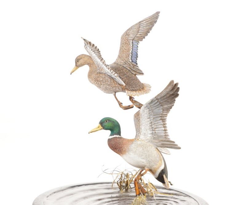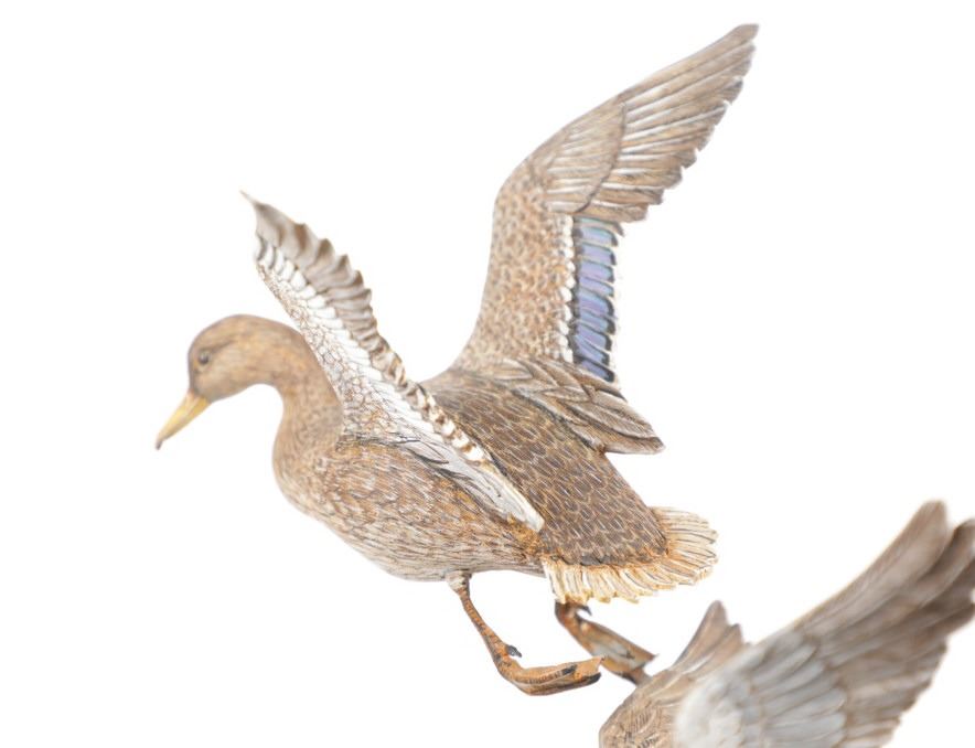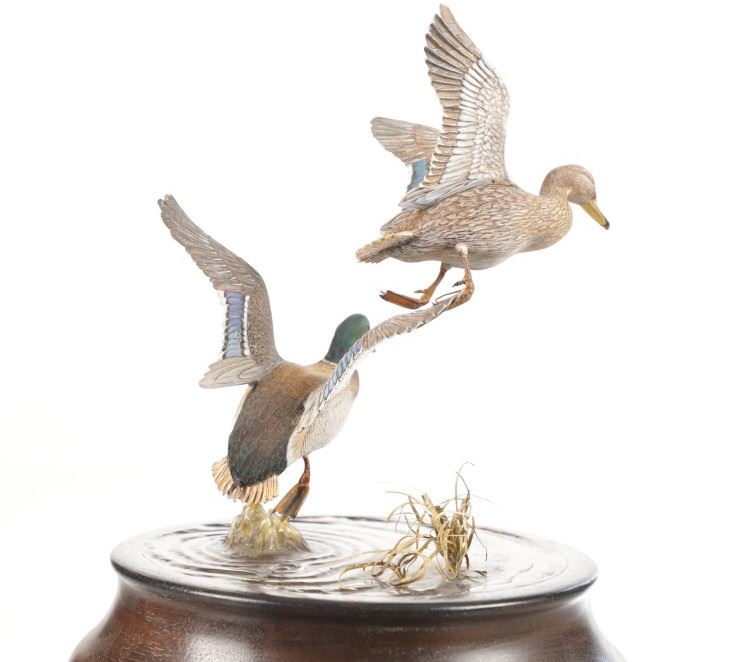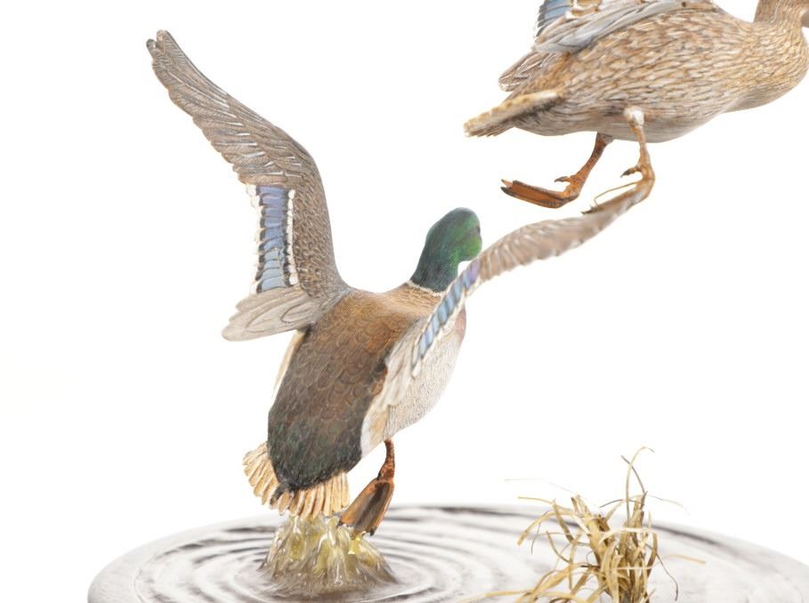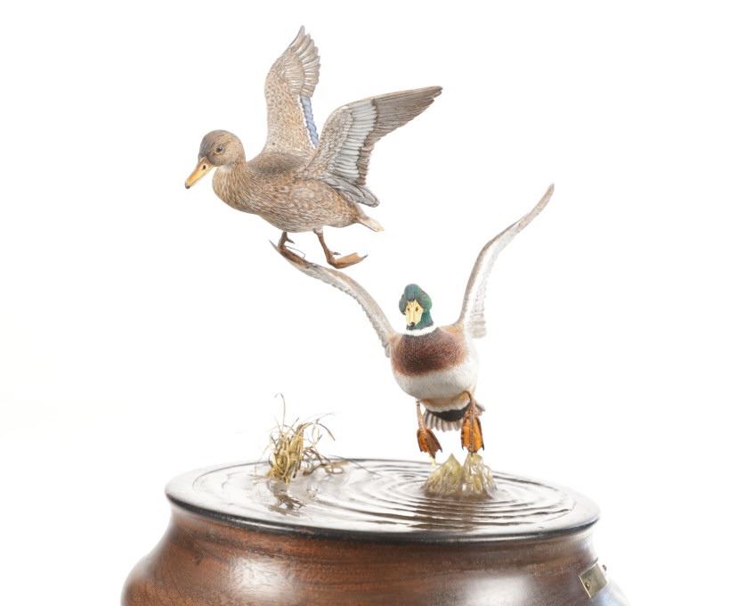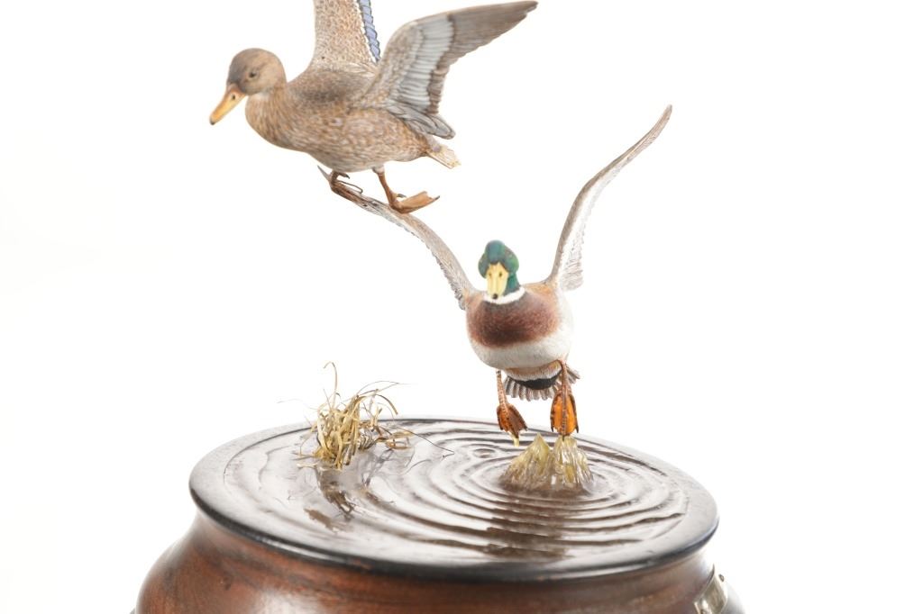 Featured in this lot is this mixed motive hand carved display of jumping mallards by artist Harry M. Vreeland born in 1908 and died in 1982. The display features a wonderfully and professionally crafted carved wooden and silica construction that shows a male and female mallard jumping and taking flight with life like characteristics all set to a stained hardwood base with a plaque that reads 'H. Vreeland.' Born in Syracuse, New York, Harry Vreeland spent most of his life working at Grumman Aerospace in Bethpage Beach. He later retired in 1972 after a long career as the chief engineer pf the antisubmarine division. In the same fashion as A.J. King, Vreeland began producing pairs of ducks and upland game birds starting in 1945, and continuing throughout his career at Grumman. Beginning in 1958 The Crossroads of Sports in New York City began to sell Vreeland’s miniature bird carvings, which they came to rely heavily on for their high market value. His work was noted for its high quality of painting, which was later in the 1960’s attributed to his wife Norma. The Vreeland’s continued to produce highly detailed miniature birds throughout their travels to South Yarmouth in Cape Cod, and Vero Beach, Florida during their retirement. The condition of this hand carved display is is well preserved condition with a slight malfunction to the connecting foot of the male mallard and some chipping to the wings of the female mallard but otherwise shows well preserved overall condition. The measurements of this display is 12" x 9 1/4" x 9 1/4". The collective weight of this display is 4lb 4oz.