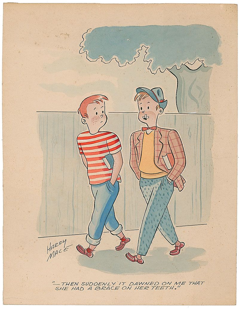 Original hand-painted color comic art, ink and watercolor on artist’s cardstock, 10.75 x 13.75, depicting a young man with a band-aid on his mouth, captioned, “—Then it dawned on me that she had a brace on her teeth.” Signed in the lower left corner, “Harry Mace.” In fine condition.