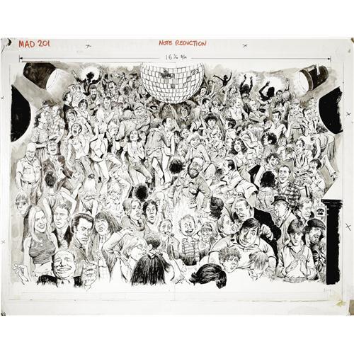 <B>Harry North - Mad #201 "A Mad Look at Discos" Original Art, Group of 2 (EC, 1978).</B></I> Boogie on down with this crazy cast of seventies disco-dancers drawn by underrated caricaturist Harry North. These two pages were mounted side-by-side on a larger support board, and a vellum overlay (with dialogue balloons) was taped to the back of the board. The image area of the combined pages measures 26" x 18", and the art is in Excellent condition. <I>From the Mad Magazine Archives</B></I>.