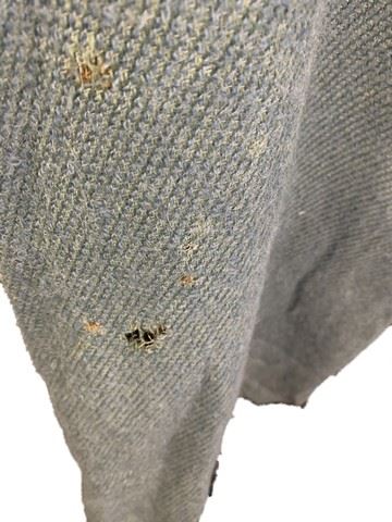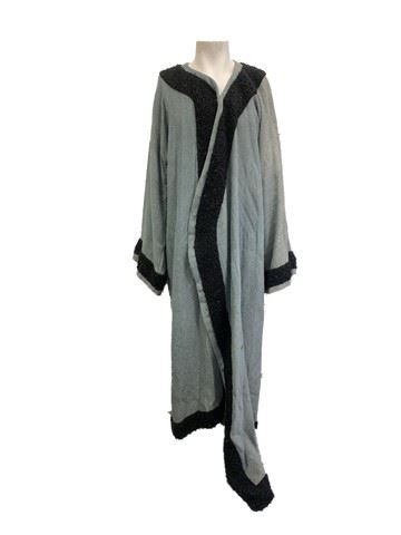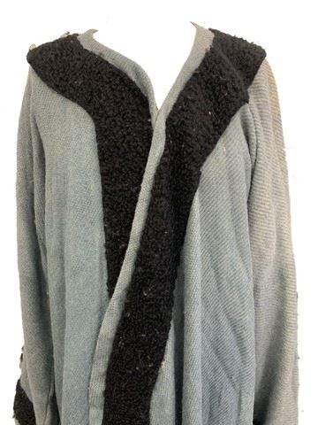 Harry Potter Amelia Bones (Sian Thomas) test, turquoise tweedwith black knit trim duster. "SJ" written on the inside collar with a jeat press barcoded inventory tag. No buttons.