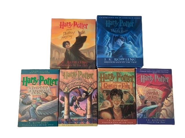 A collection of Harry Potter unabridged compact discs for Harry Potter and The Deathly Hallows and Harry Potter and The Order of the Phoenix. Also included is unabridged cassette tapes for Harry Potter and the Prisoner of Azkaban, Harry Potter and the Sorcerer's Stone, Harry Potter and the Goblet of Fire, and Harry Potter and the Chamber of Secrets. Original retail values of the cassette tapes was $34 (per box) and the audible cds were originally priced at $75 retail.