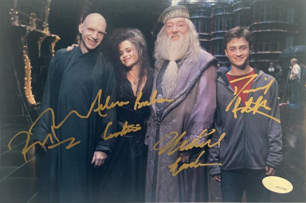 Harry Potter cast signed movie photo autographed by Daniel Radcliffe, Ralph Fiennes, Helena Bonham Carter, and Michael Gambon. 9x12 inches. HL20275