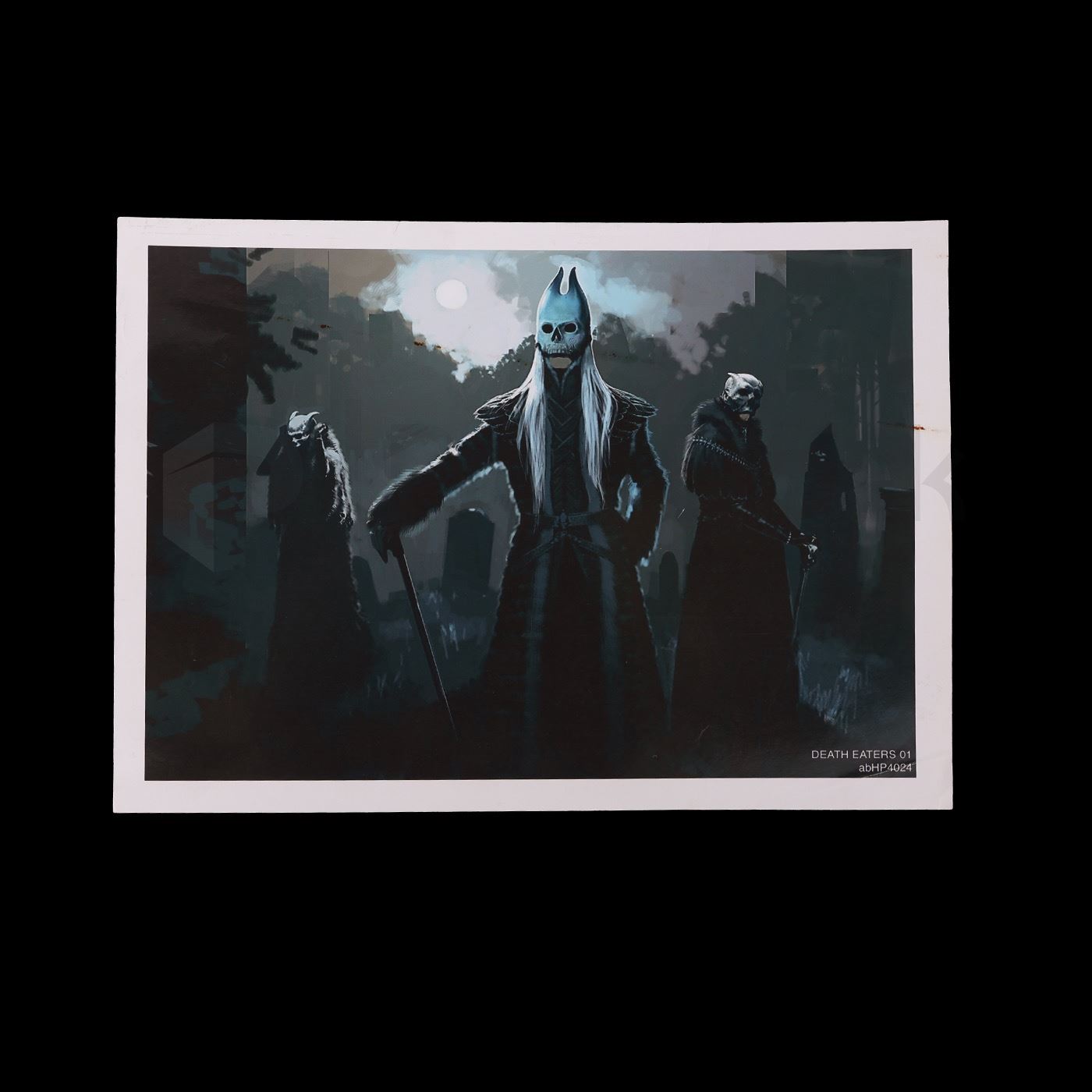 Concept artwork created by the production of the Harry Potter film franchise. Harry Potter is a film series based on the eponymous novels by J. K. Rowling. The series is distributed by Warner Bros. and consists of eight fantasy films, beginning with Harry Potter and the Philosopher's Stone and culminating with Harry Potter and the Deathly Hallows – Part 2. This piece features an image of three Death Eaters and is a printed copy in full color on glossy 8.5" x 10" paper and was used by the art department. This piece remains i excelled, production used condition.