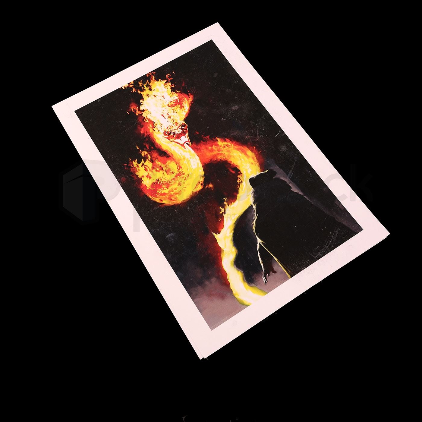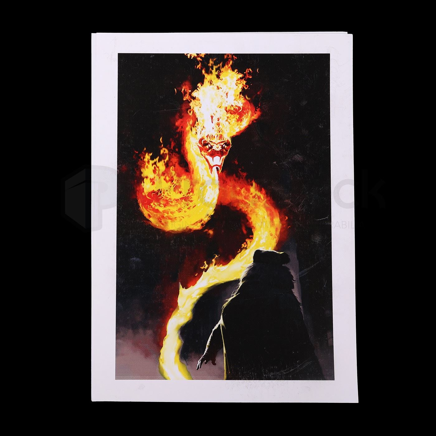 Concept artwork created by the production of the Harry Potter film franchise. Harry Potter is a film series based on the eponymous novels by J. K. Rowling. The series is distributed by Warner Bros. and consists of eight fantasy films, beginning with Harry Potter and the Philosopher's Stone and culminating with Harry Potter and the Deathly Hallows – Part 2. This piece features an image of a flaming sake and is a printed copy in full color on glossy 8.5" x 10" paper and was used by the art department. This piece remains i excelled, production used condition.
