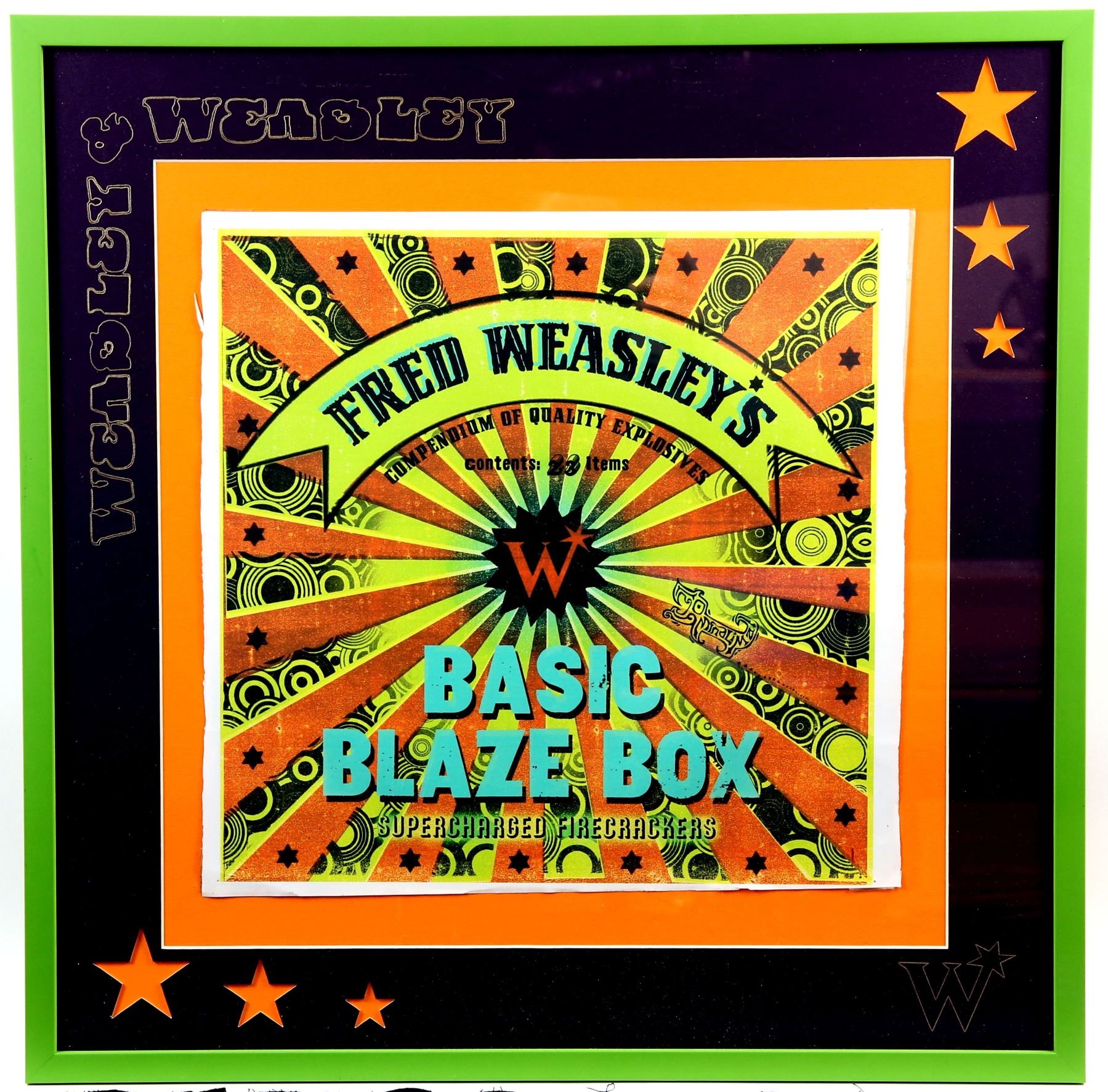 Harry Potter - Fred Weasley's Basic Blaze Box Original production made large basic blaze box label. This was a product from the Explosive Enterprises line by Weasleys' Wizard Wheezes. Fred Weasley came up with the idea for the Basic Blaze Box. It contained an assortment of magical fireworks such as whizz-bangs and whammy rockets. It cost one Galleon, sixteen Sickles and nine Knuts. Framed and mounted, overall 58 x 58 cm.Provenance: With certificate of authenticity.