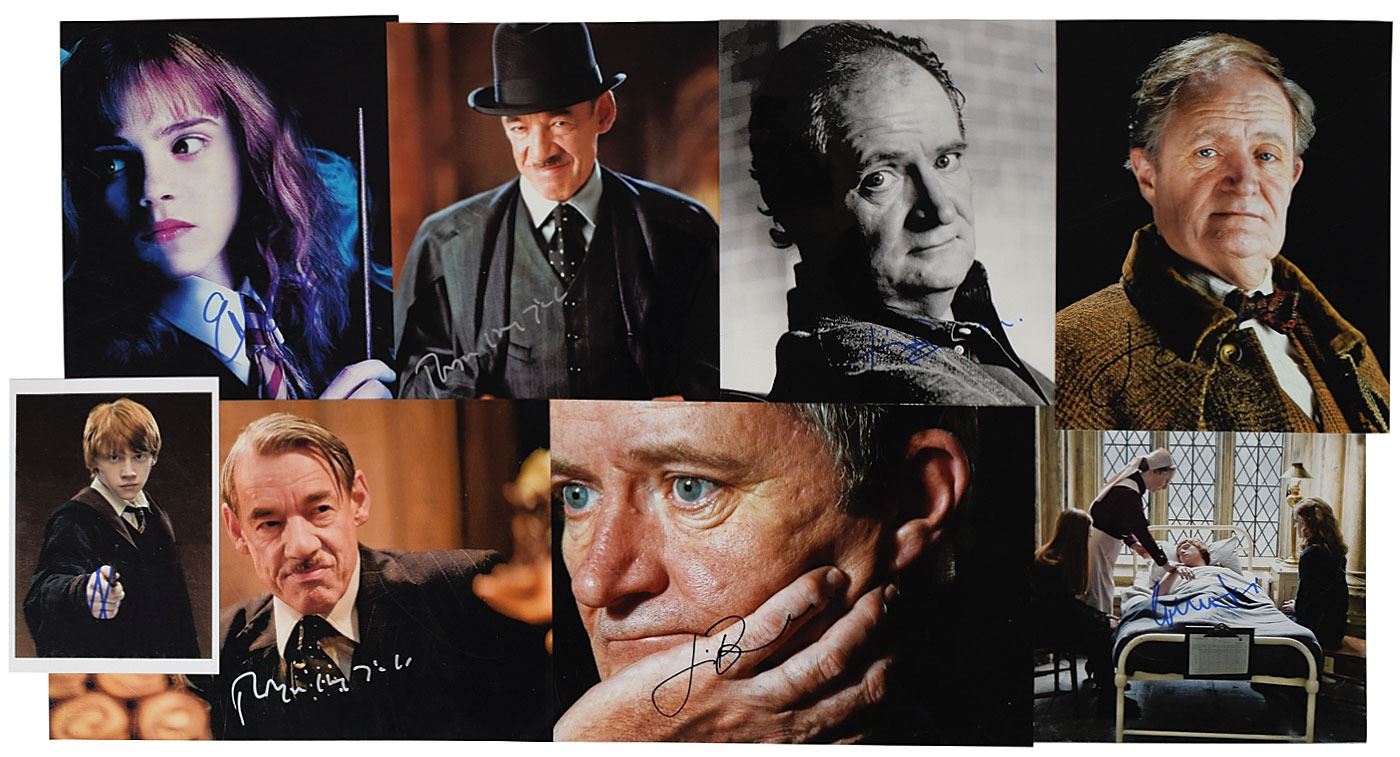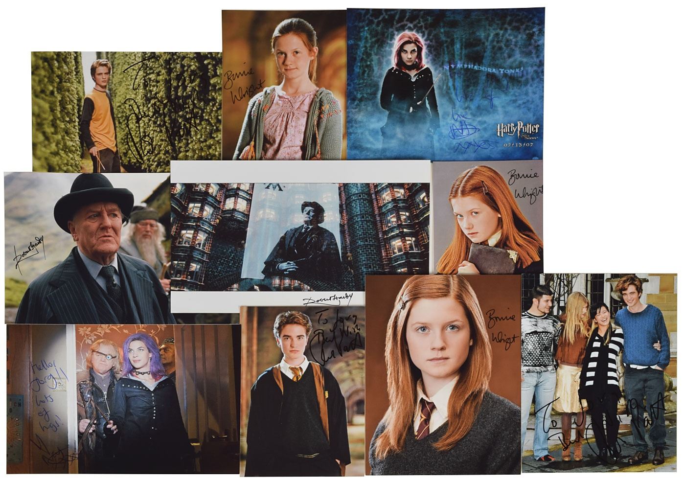 Magical collection of 38 photos of performers from the Harry Potter film series, various finishes, ranging in size from 3.5 x 4.25 to 12 x 8, each signed in ink or felt tip by the pictured actor or actress, with several inscribed, including: Daniel Radcliffe (2), Emma Watson, Rupert Grint (2), David Bradley (6), Jim Broadbent (3), Robbie Coltrane, Robert Hardy (2), Jason Isaacs, Matthew Lewis, Roger Lloyd-Pack (2), Evanna Lynch, Robert Pattinson (3), Alan Rickman, Maggie Smith, Natalia Tena (2), David Tennant, David Thewlis (4), Zoe Wanamaker, and Bonnie Wright (3). In overall fine condition.
