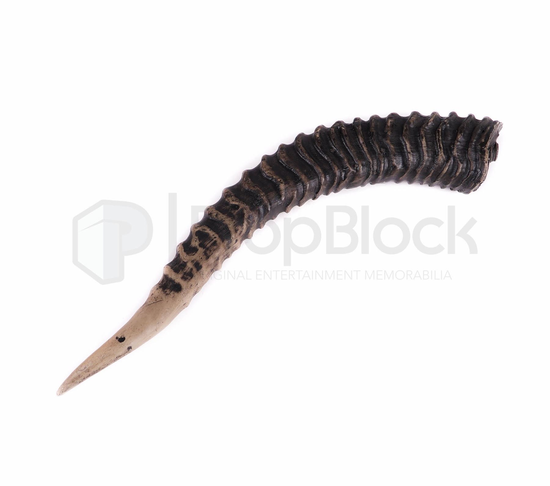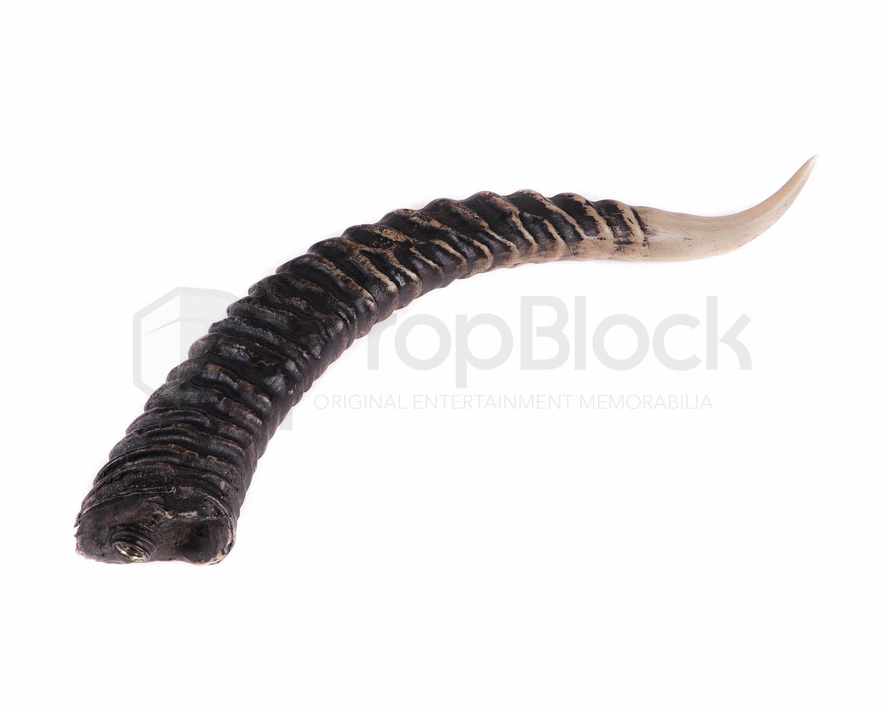 Beat horn made for the production of the Harry Potter films. This piece was made as an option by the production, but unknown if seen on screen. Made of resin it is "corkscrew" in shape and has been painted a grey brown color with hints of black and off white. There is a small metal screw post on the bottom where it would have been attached to an animatronic beast and was originally sold in the Universal Studios Prop Shop.