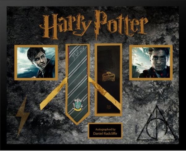 Custom framed Harry Potter Signed Tie and Movie Collage. Tie autographed by Daniel Redcliffe. Approximate dimensions are 24x24. This item is authenticated by Beckett. This item comes with a Certificate of Authenticity from a third party authenticator. This Certification of Authenticity does not imply that the item will be certified by any other rival authentication companies. The accompanied certification is the only certification the auction company can confirm. These items are being sold as collectable pieces and there is no guarantee that this item can be resold on any online marketplace. Each of these companies has their own policies and politics.