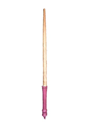 This is one of the screen used wands from Professor Flitwick's class in 2001's 'Harry Potter and the Sorcerer's Stone.' The wand was screen used used by one of the students in Prof. Flitwick's class, is made from a wooden dowel, and is affixed to a plastic, plum-colored handle.