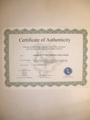 This is one of the screen used wands from Professor Flitwick's class in 2001's 'Harry Potter and the Sorcerer's Stone.' The wand was used by one of the students in Prof. Flitwick's class, is made with a wooden dowel, and is affixed to a black resin handle. Comes with COA. (measures approx. 14 3/4" long)