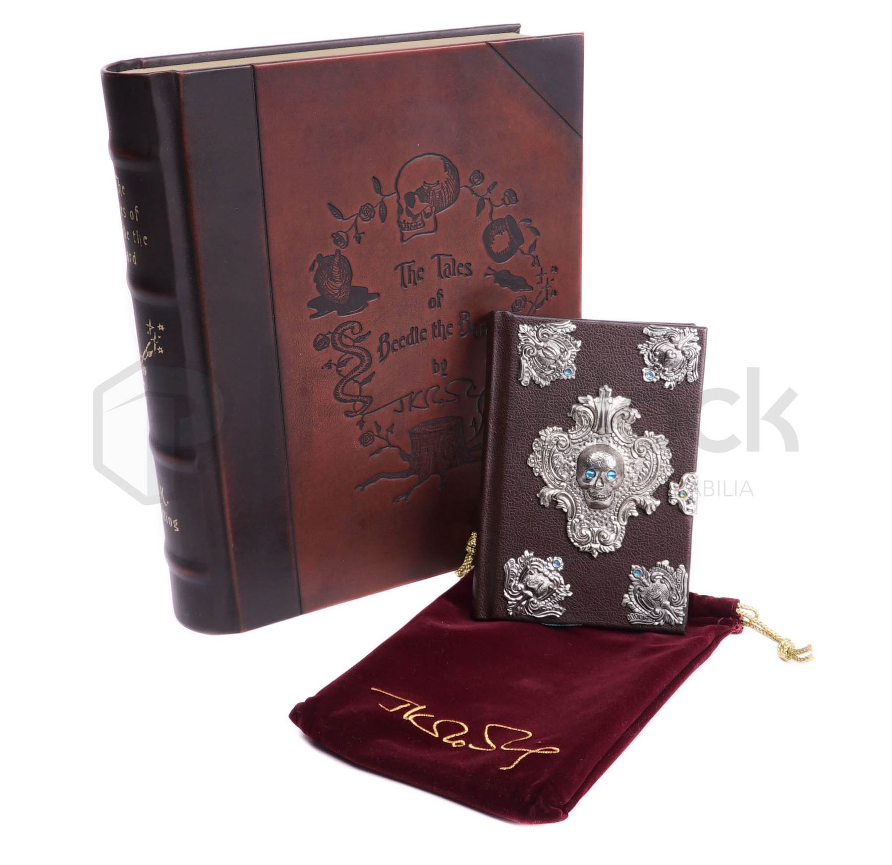 Limited edition of the wizarding fairytale story of "Tales of Beetle The Bard" by author J.K. Rowling. This book featured a collection of original stories by the author which were featured in the franchise Harry Potter. This limited edition book set features a leather bound copy of the tales which are printed exactly how the author written them years before. The book features cast metal pieces attached to the book with a metal closure and comes in a red felt draw string bag with the authors signature stitched in gold thread. The book in enclosed in a larger housing made to look like a old fashioned book, with a leather cover. This collection includes a selection of printed art prints as seen in the book depicting scenes from the stories of Beetle the Bard. This limited edition collectors set remains in excellent condition.
